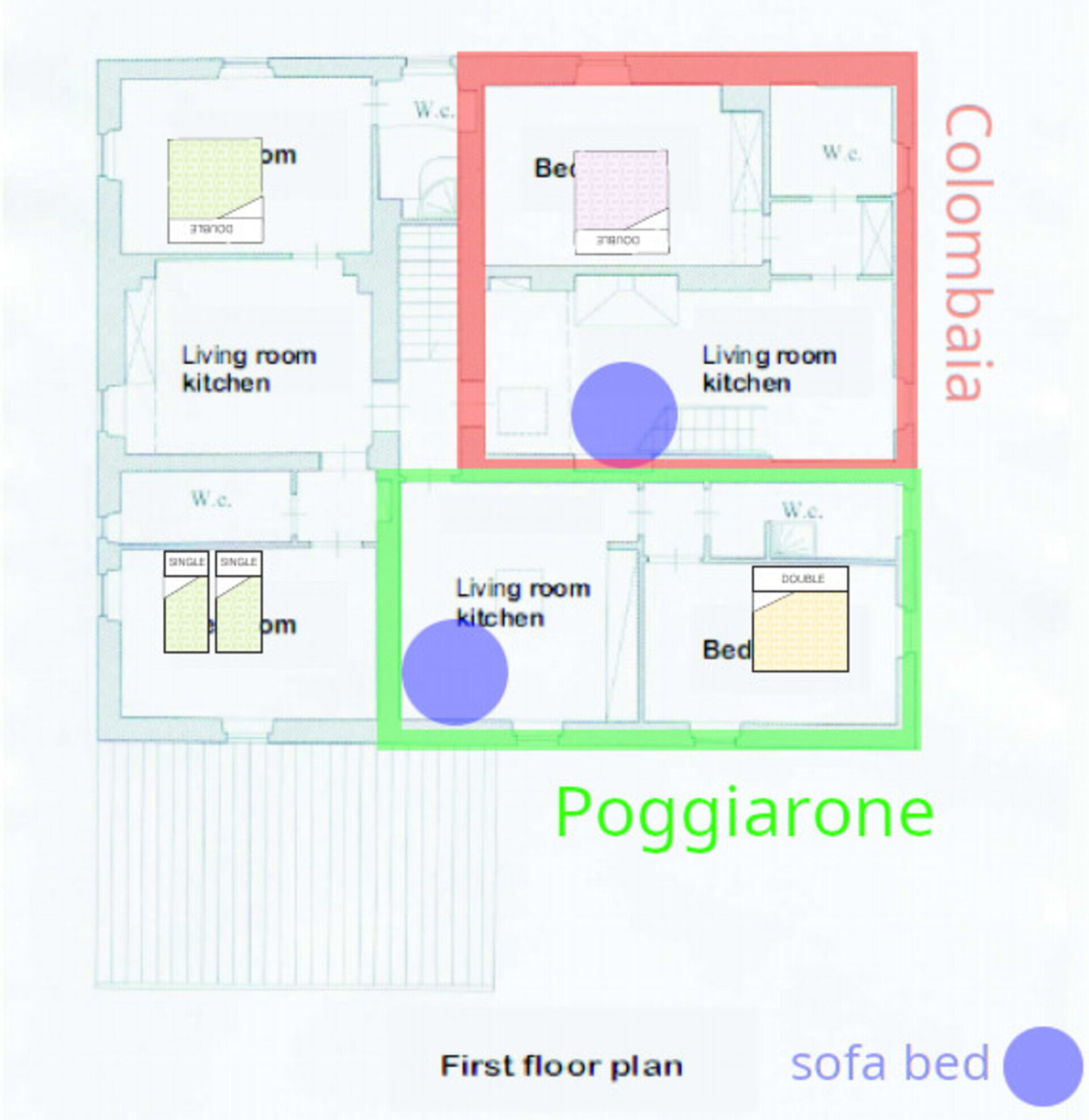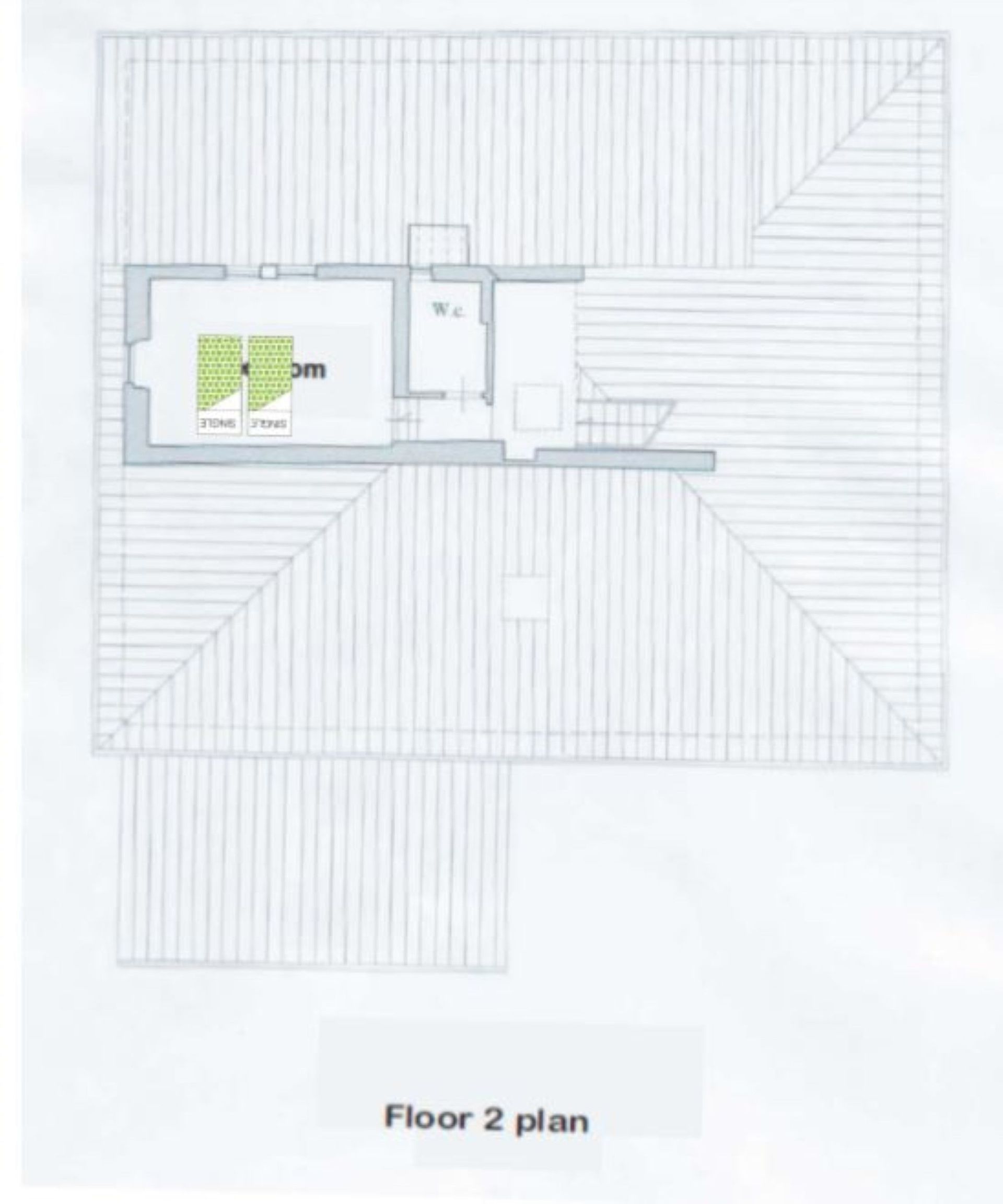 Annex:auf zwei Etagen mit Küche und Wohnzimmer (Esstisch, Herd, Kühlschrank, Gefrierschrank), einem kleinen Bad mit Waschbecken, WC und Dusche im EG; im 1. Stock ist ein Schlafzimmer mit Doppelbett, ein Schlafzimmer mit einem Einzelbett und ein Bad mit Waschbecken, Bidet, kleine Dusche, WC. Der Zugang zum Annex ist sowohl aus dem Erdgeschoss als auch aus dem 1. Stock möglich.