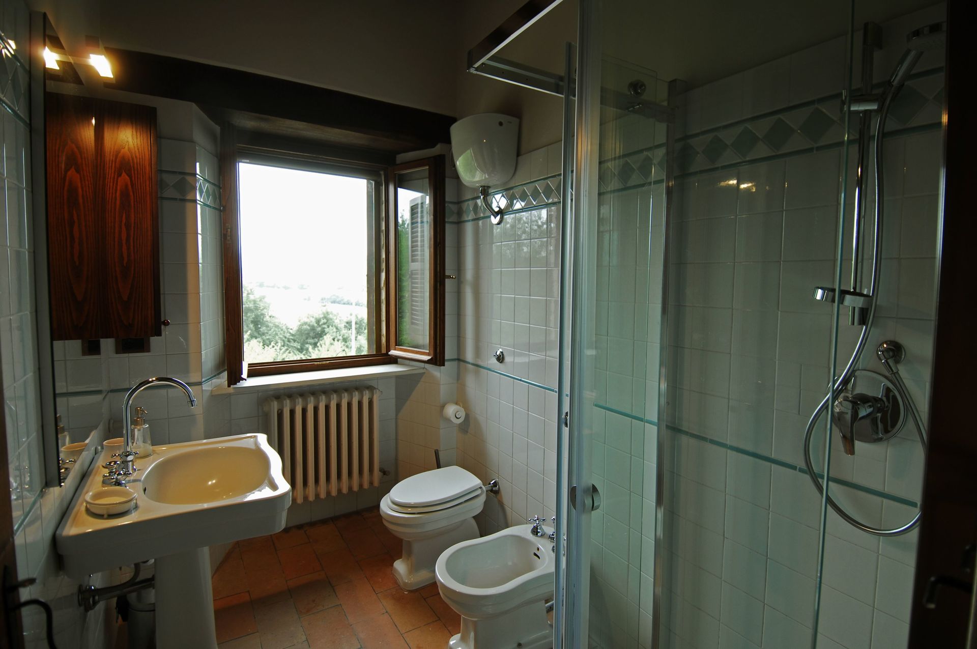 Badezimmer (8 m2): Waschbecken, WC, Bidet, Dusche, Fön, WiFi Internet, Fliegengitter.