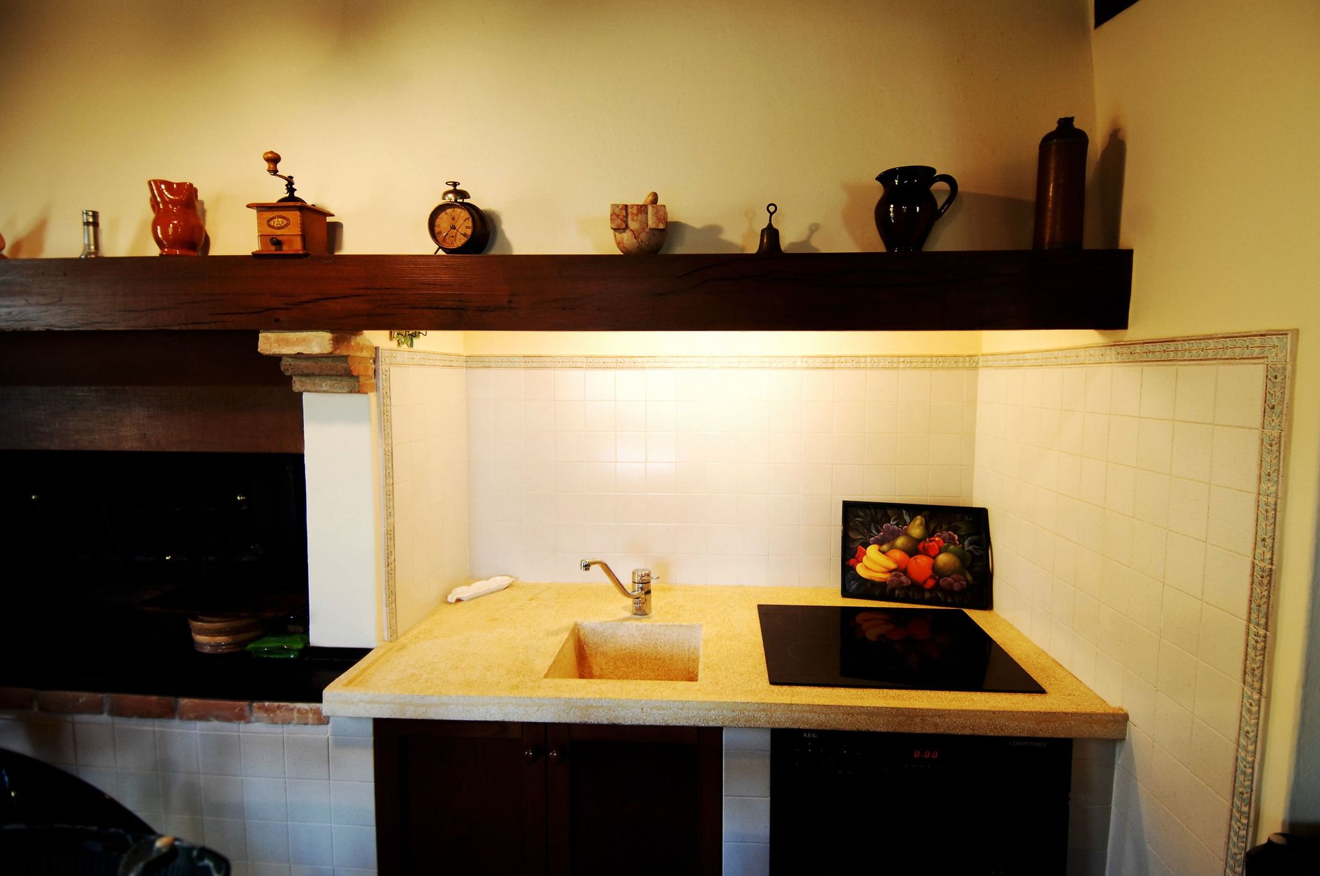Wohnküche (40 m2): gut ausgestattete Küche, Esstisch (Personen: 12), Spülmaschine, Kühlschrank, Tiefkühler, Mikrowelle, Herd, Ofen, Italienische Kaffeemaschine, Amerikanische Kaffeemaschine, Waschmaschine, Sessel, Kamin, Doppel-Schlafsofa (Breite: 2m, Länge: 2m), WiFi Internet, Klimaanlage, Fliegengitter, Satelliten-TV, Ausgang auf den Garten, Ausgang auf die Terrasse.