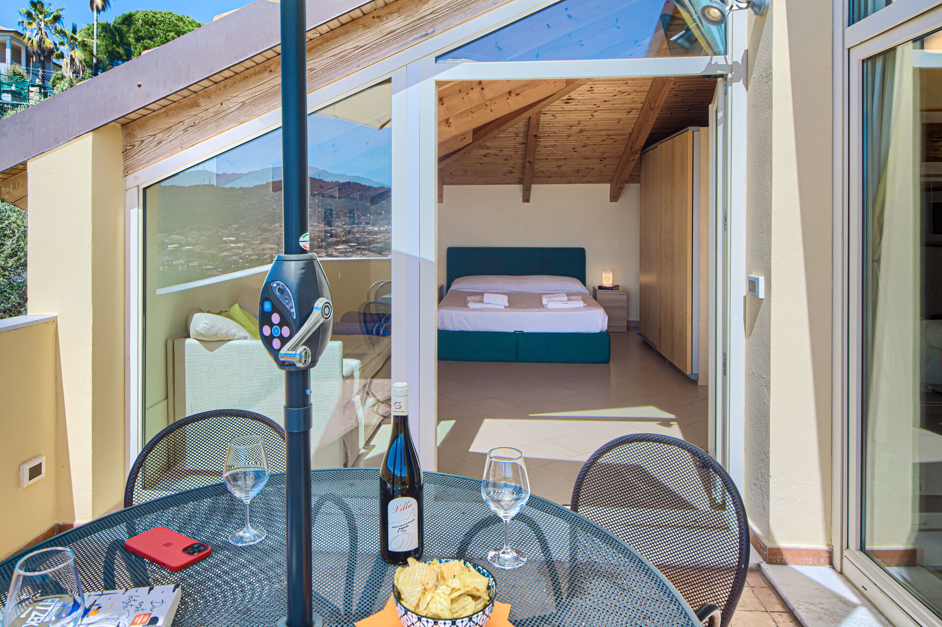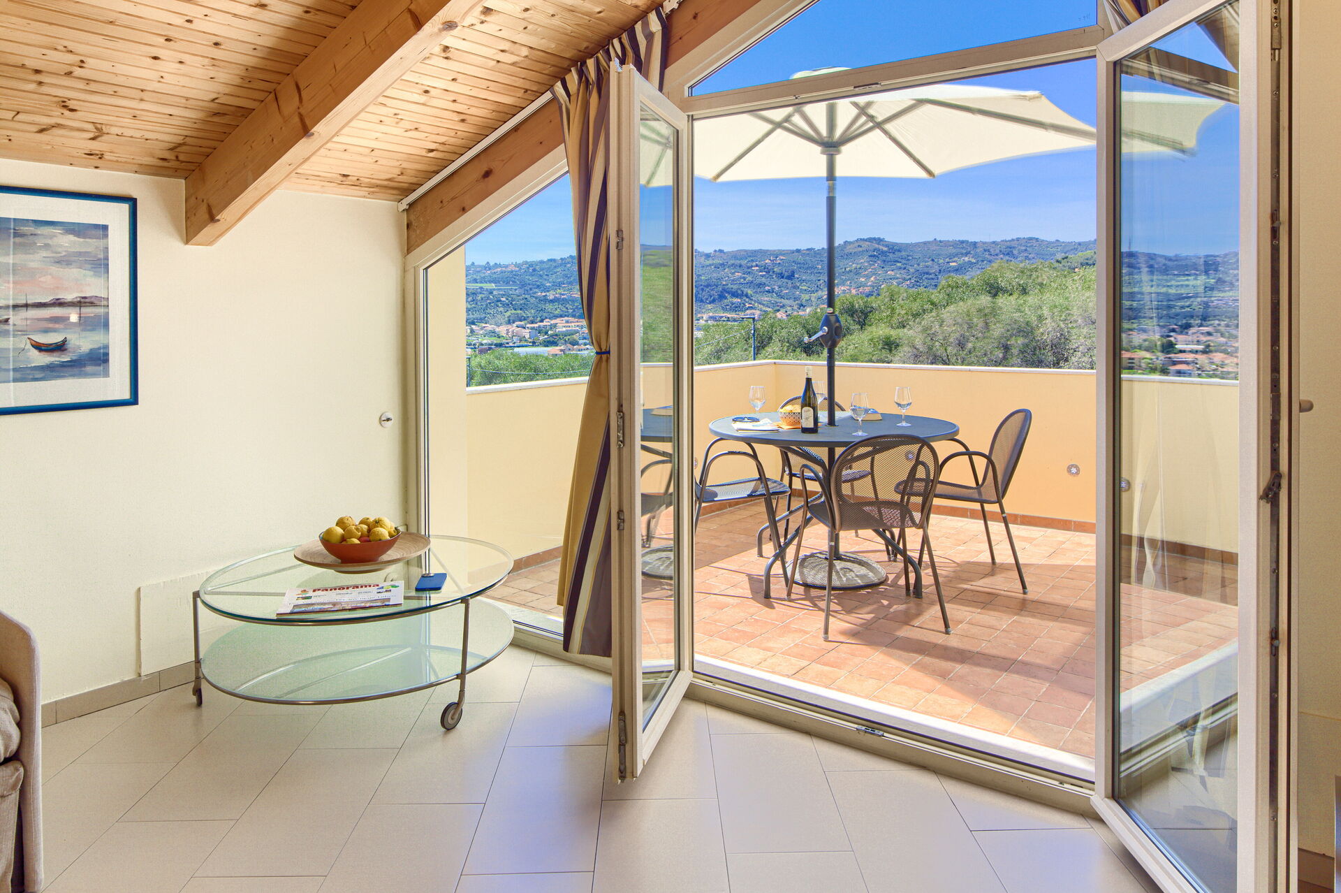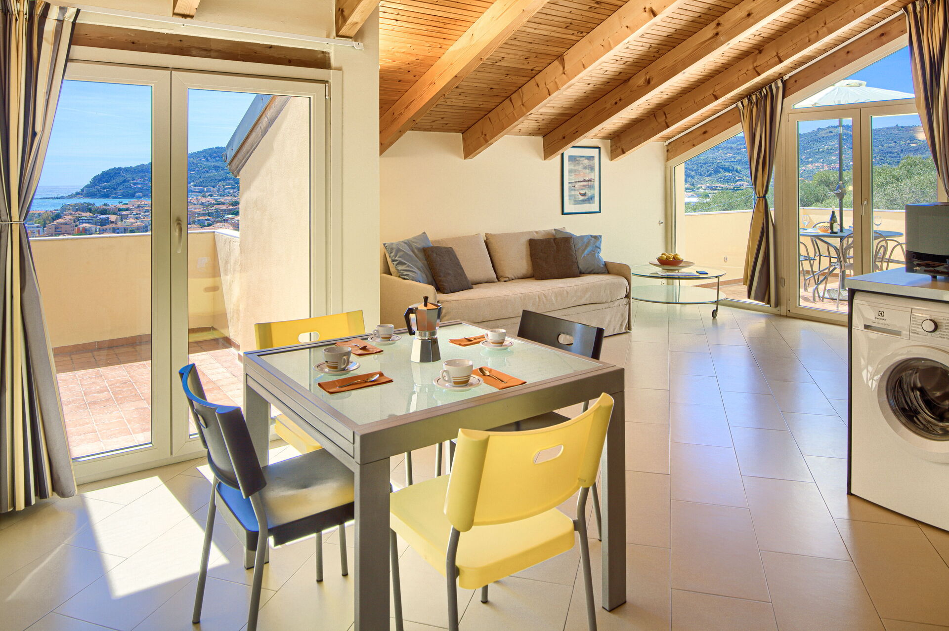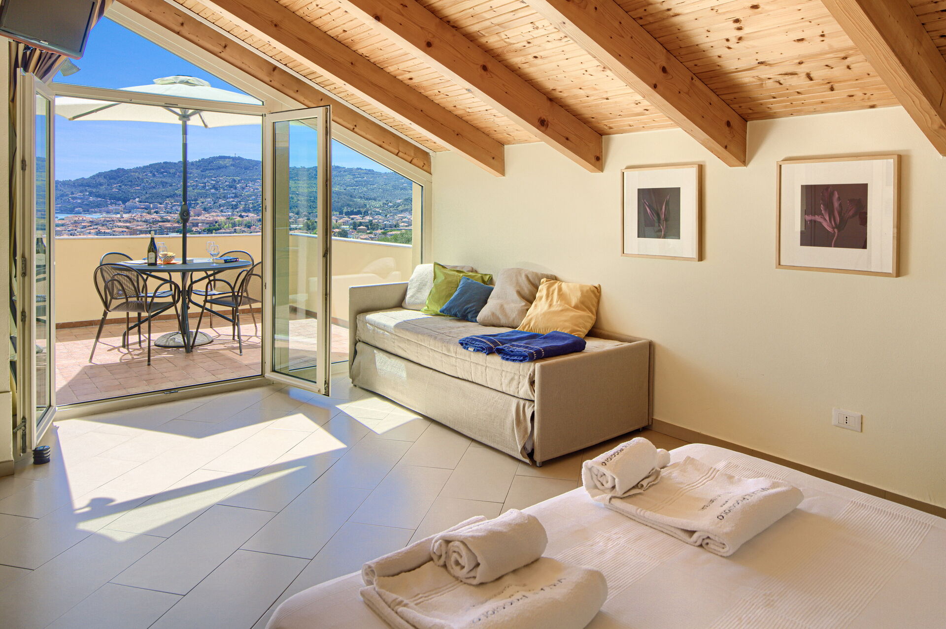 Das Apartment „ViP Panorama 2“ befindet sich im ersten Stock. Es verfügt über zwei Terrassen mit atemberaubendem Panoramablick.