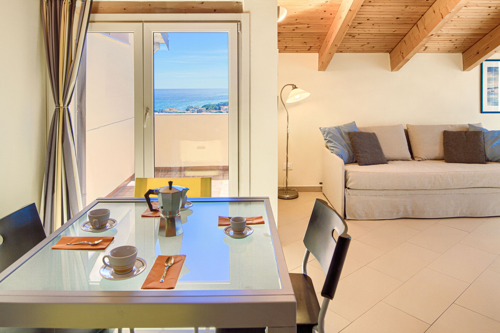 Die größere Terrasse ist zum Essen möbliert und bietet Ihnen einen herrlichen Meerblick. Sie erreichen die Terrasse sowohl vom Wohnzimmer als auch vom Schlafzimmer aus.