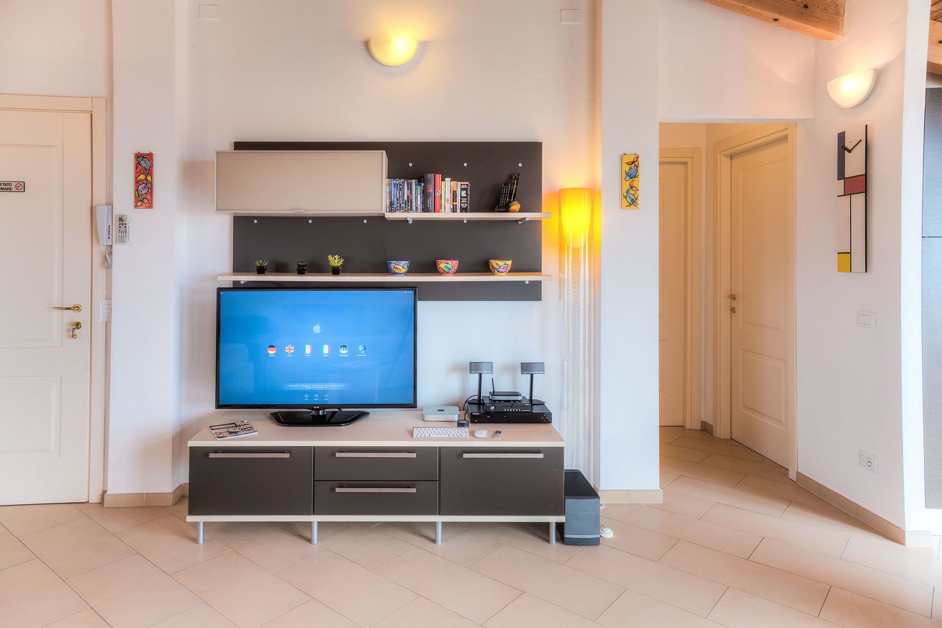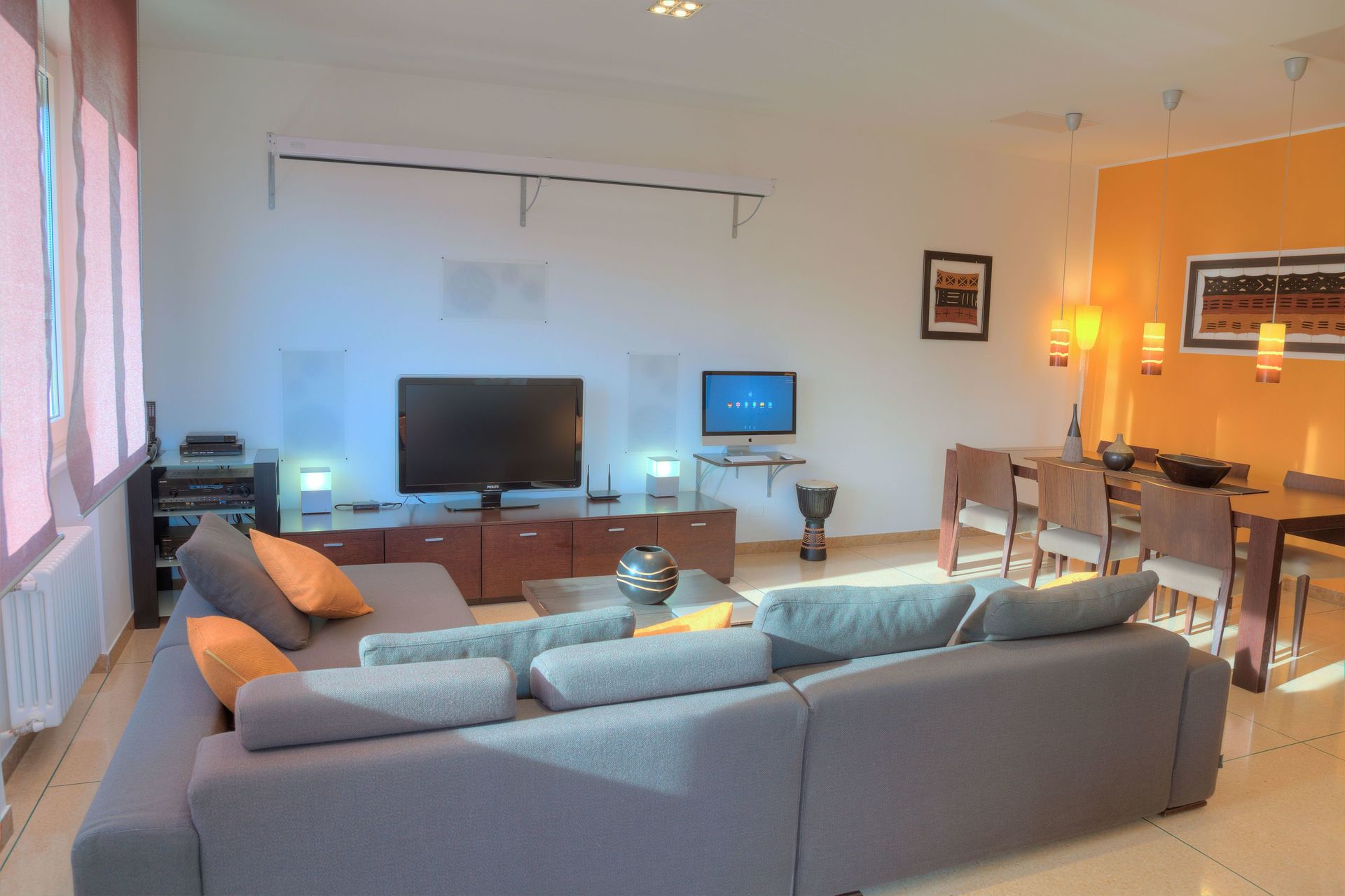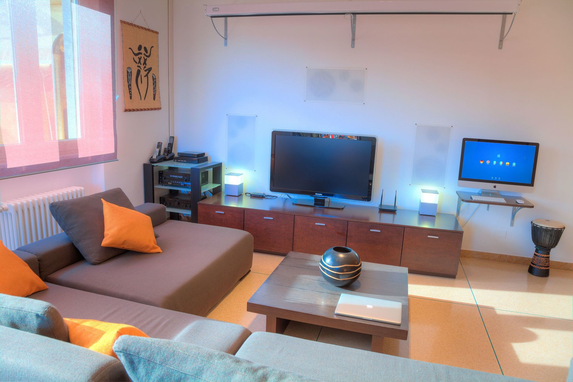 Musik in jedem Zimmer. Heimkinoanlage. Zwei Apple Mac-Computer. Kostenloses WLAN. Satellitenfernsehen.