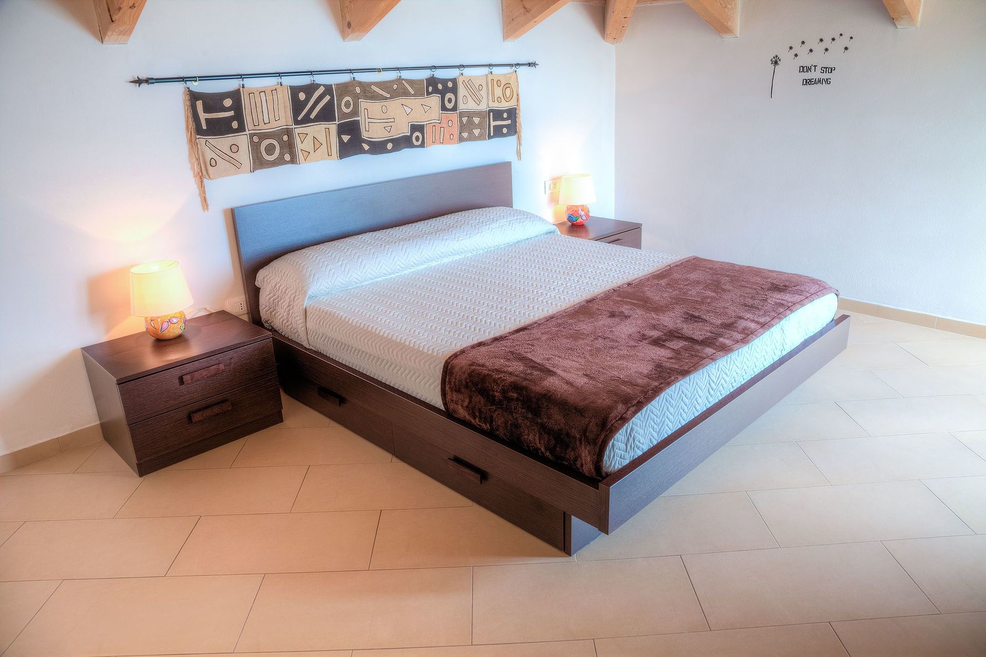 Ein Doppelbett, ein Kleiderschrank und eine Kommode.