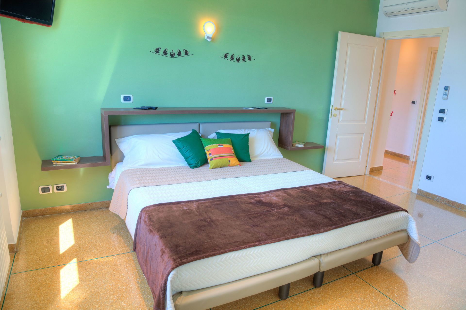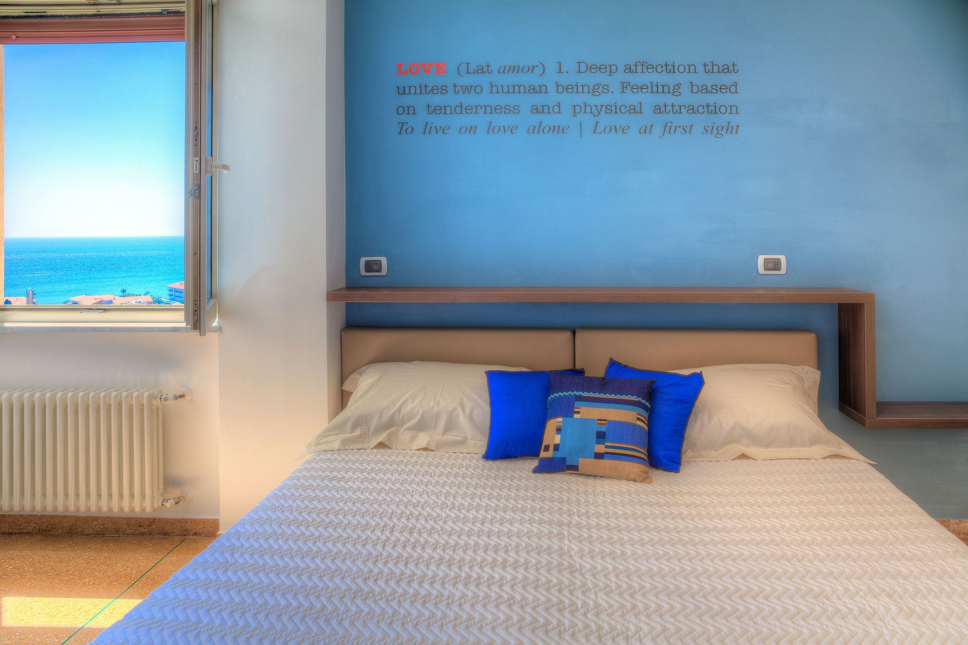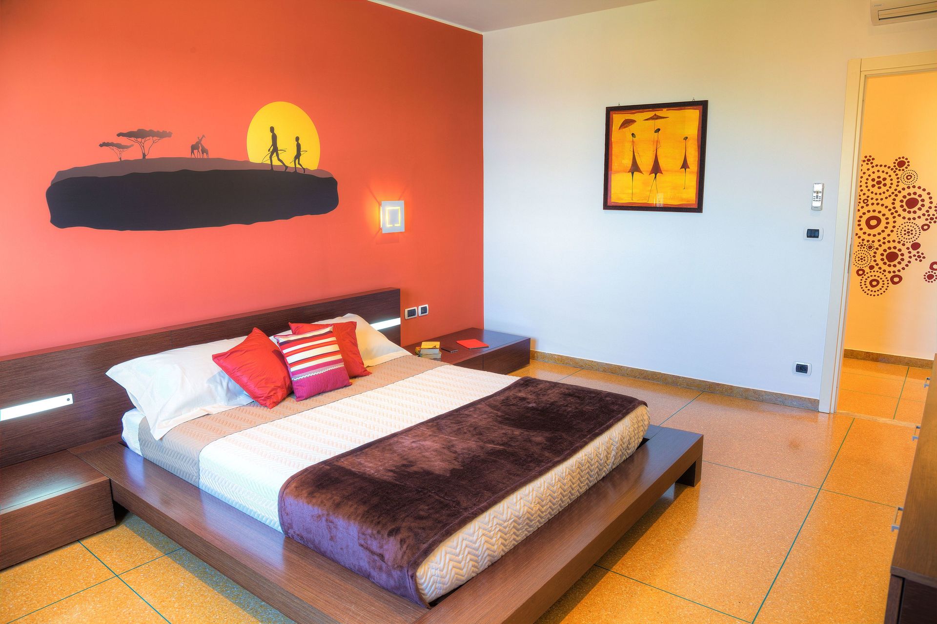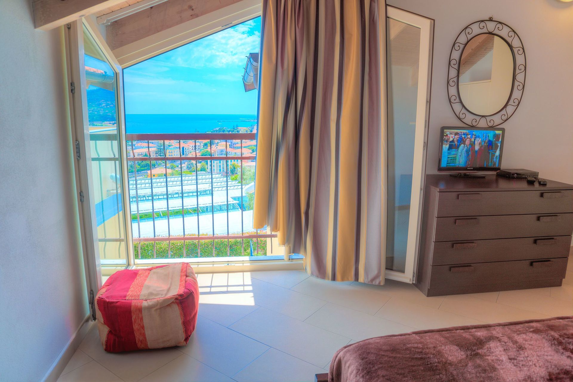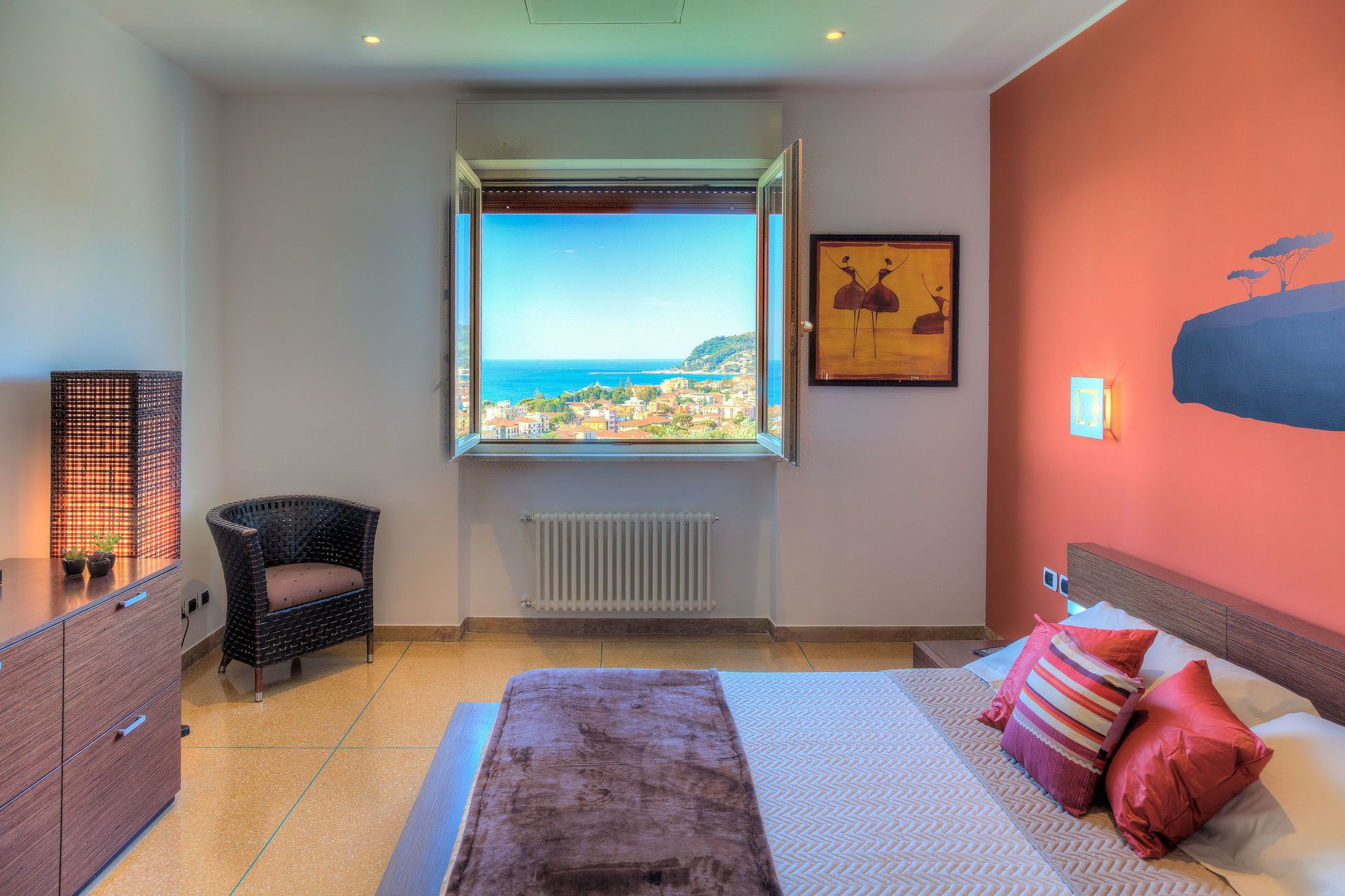 Hauptschlafzimmer (das rote Schlafzimmer): modern mit ethnischen Akzenten. Ein Doppelbett. Flachbildfernseher mit Satellitenempfang. Fenster mit Meerblick.