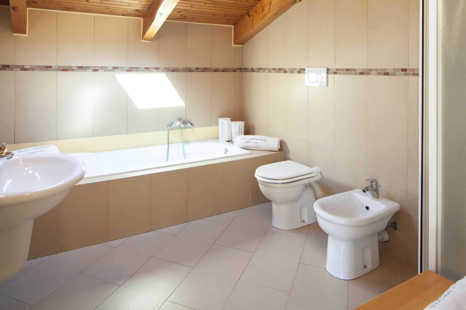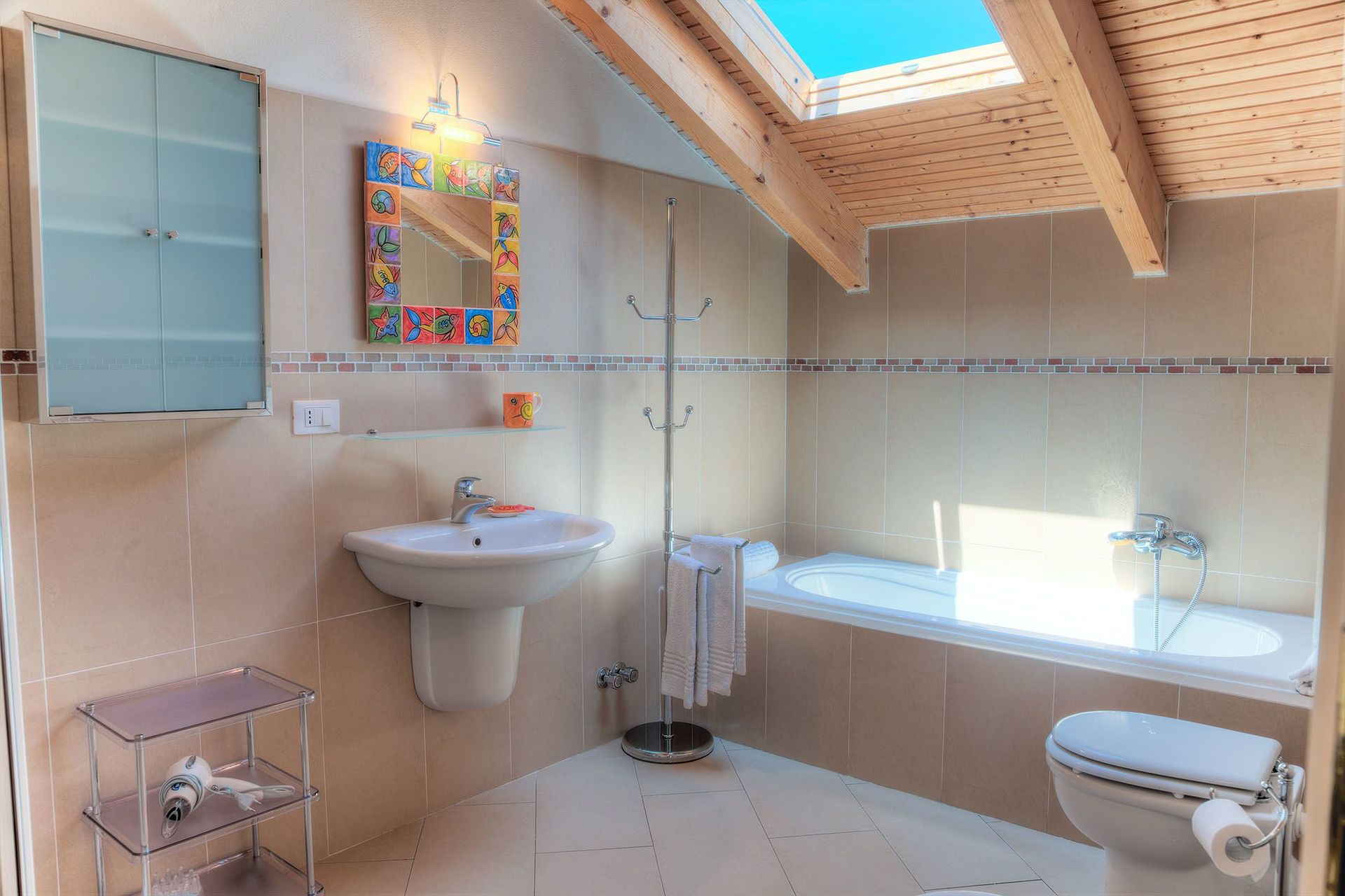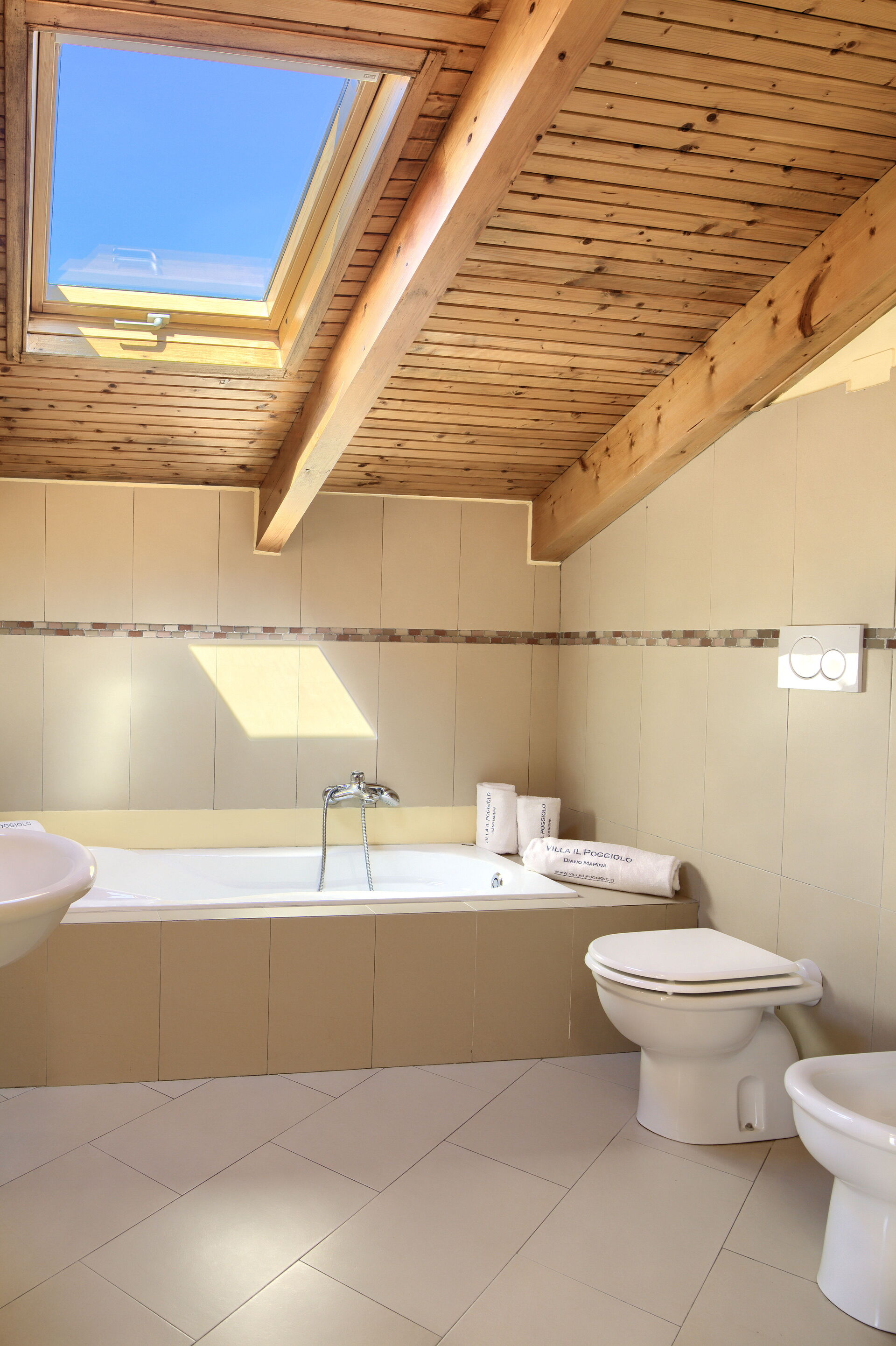 Das Badezimmer ist groß und komfortabel. Es verfügt über eine Badewanne und eine Dusche, ein Waschbecken mit Spiegel und Armaturen sowie ein Dachfenster.