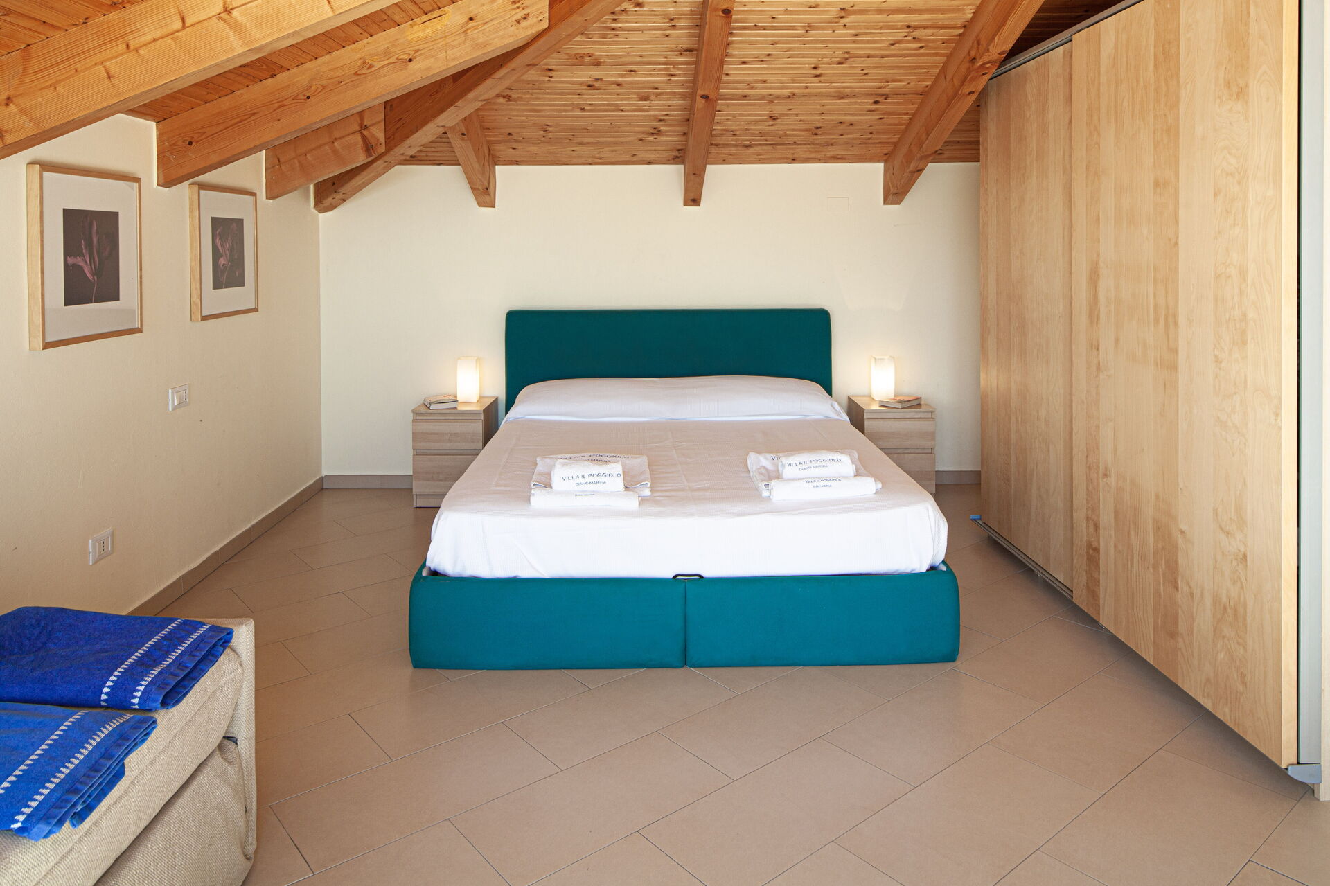Gästezimmer (das blaue Schlafzimmer): Es gibt zwei Einzelbetten, die bei Bedarf zu einem Doppelbett zusammengestellt werden können. Ein großer Kleiderschrank bietet viel Platz für Gepäck und Kleidung.