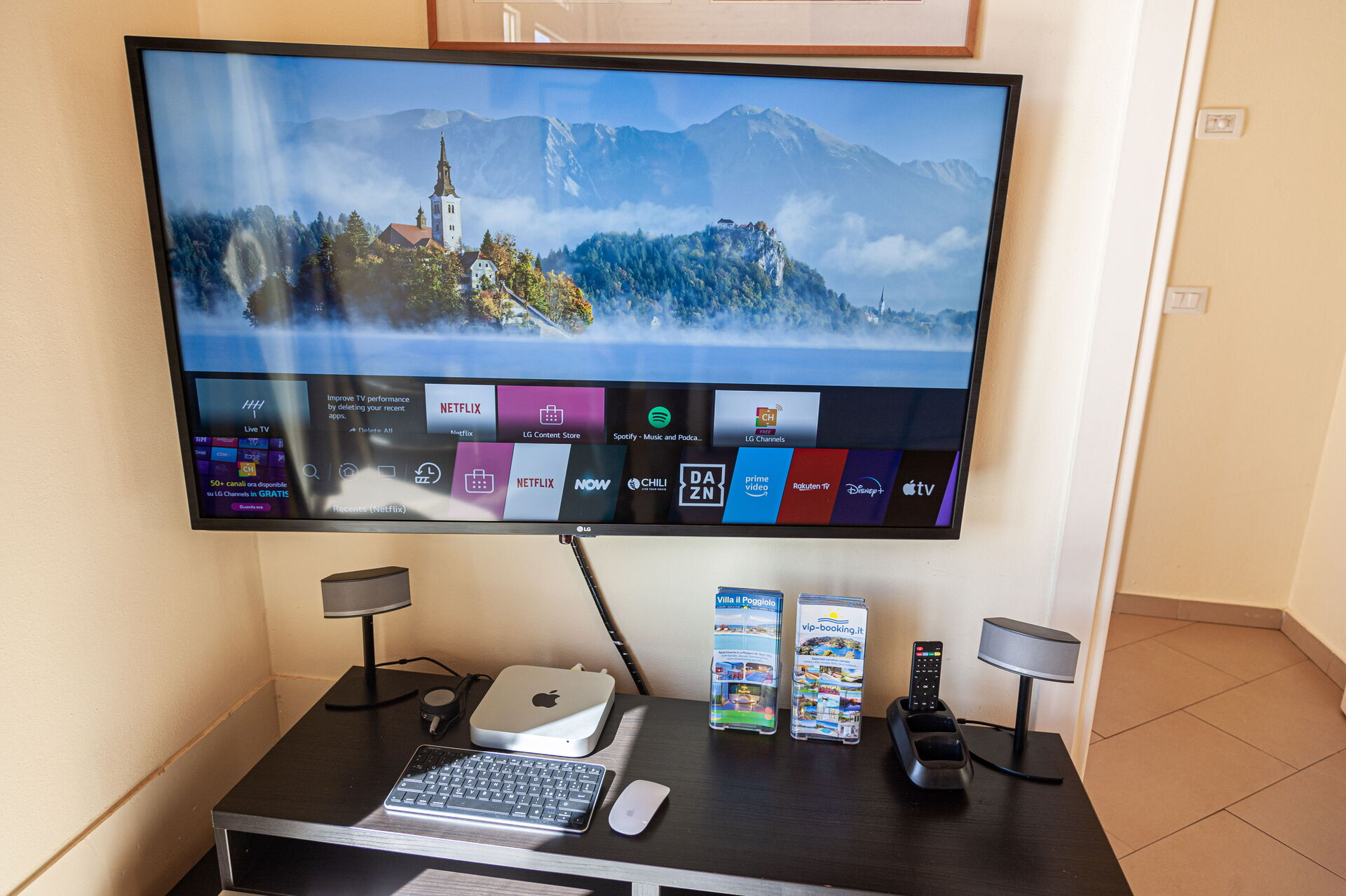 47-Zoll-Full-HD-Fernseher, DVD- und Blu-ray-Player, Satellitenreceiver mit allen europäischen Free-TV-Sendern, Apple Mac mini-Computer mit Hunderten von CDs und einem Vollabonnement für Apple Music.