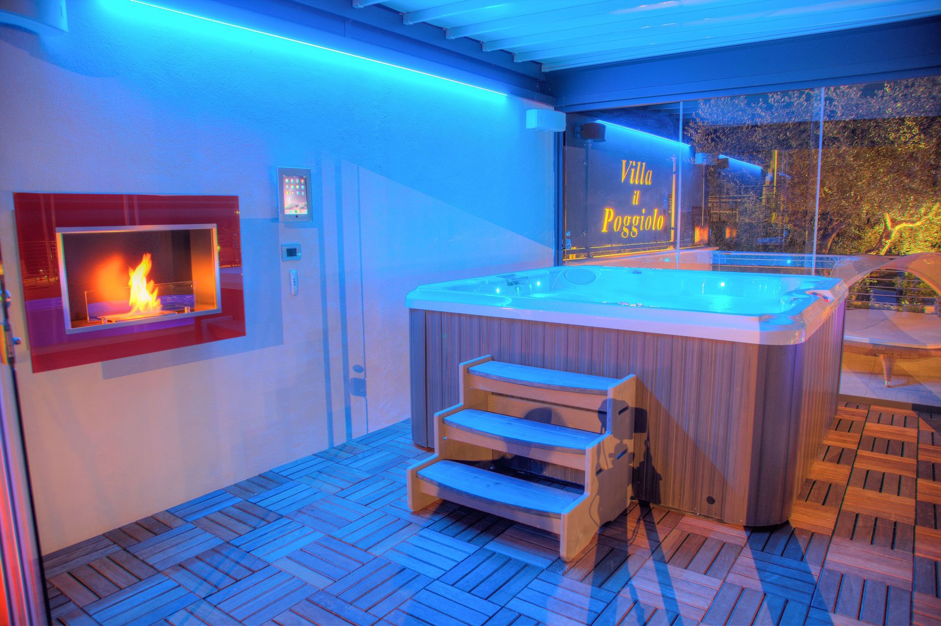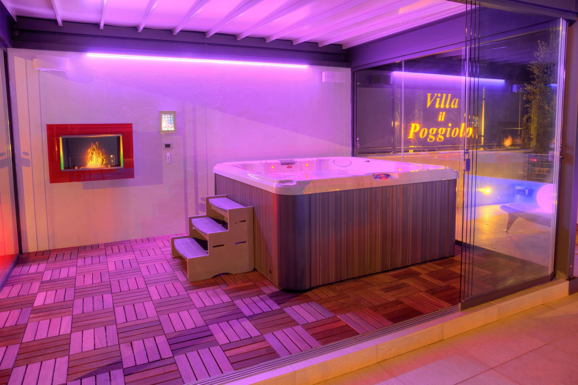 Der Jacuzzi-Whirlpool, der Platz für bis zu 6 Personen bietet, befindet sich in einem Glashaus mit motorisiertem Dach und ist ideal zum Entspannen und Sternebeobachten.