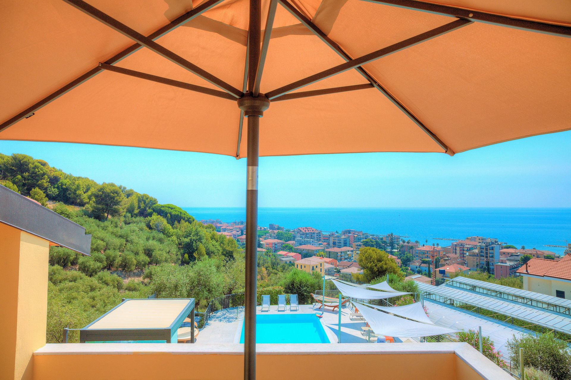 Die atemberaubende Panoramaterrasse mit Sonnenschirm ist für Ihr Essvergnügen ausgestattet und bietet Ihnen einen herrlichen Blick auf den Pool und das Meer.