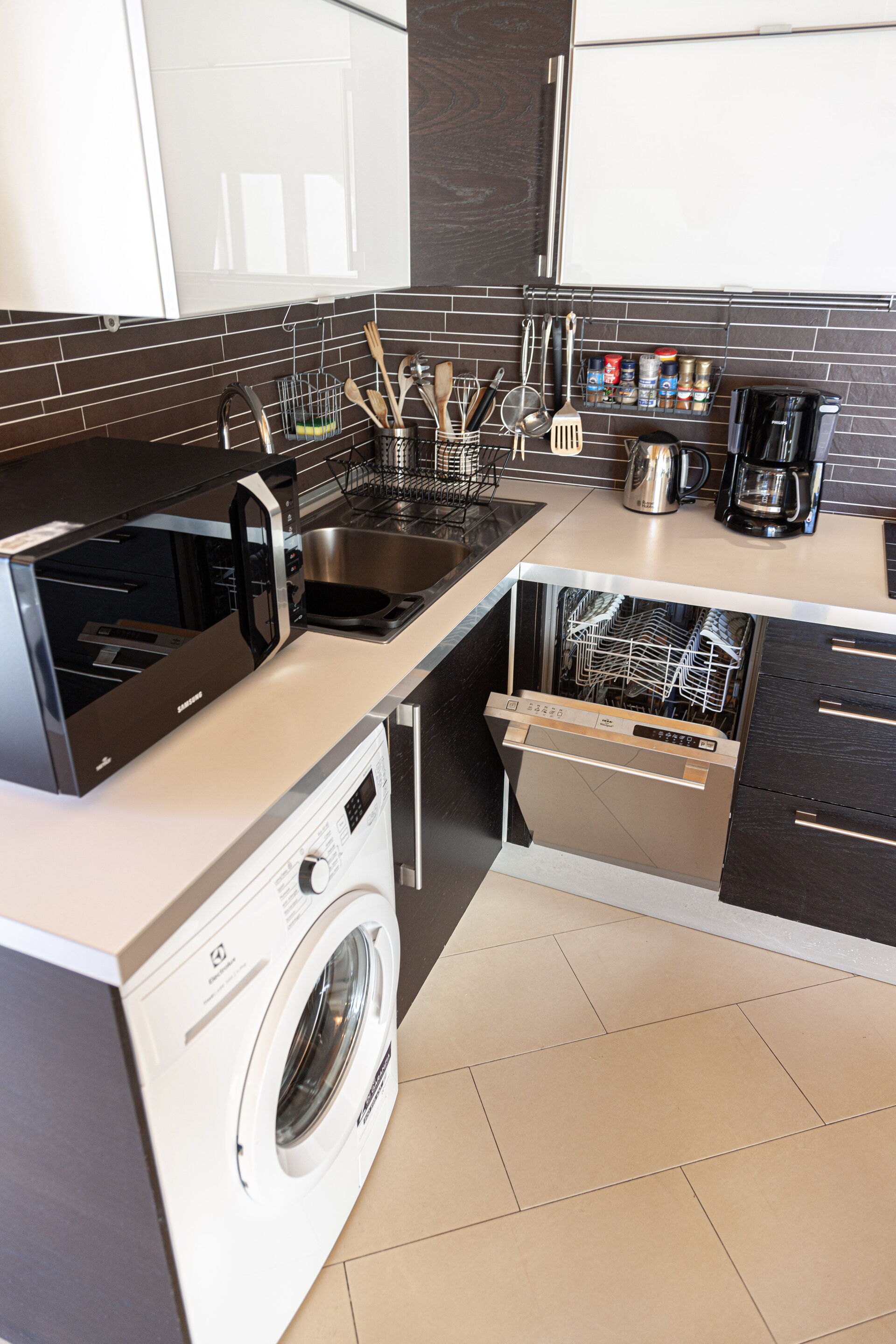 Spülbecken, Kochfläche, kleiner elektrischer Konvektionsofen (Kombinationsmikrowelle), Kühlschrank, Gefrierfach, Geschirrspüler und Waschmaschine.