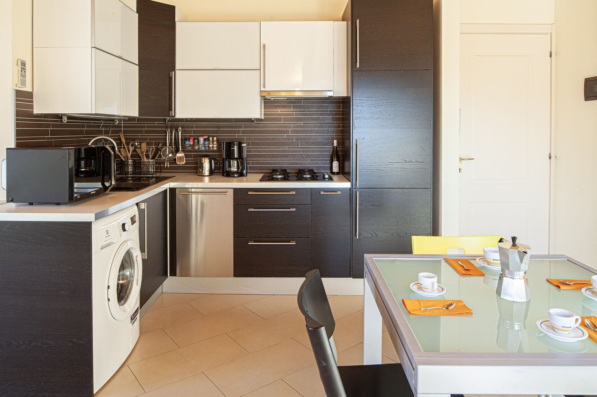Die Küche ist ausgestattet mit Spüle, Gasherd, Elektroherd, Mikrowelle, Kühlschrank, Gefrierfach und Geschirrspüler.