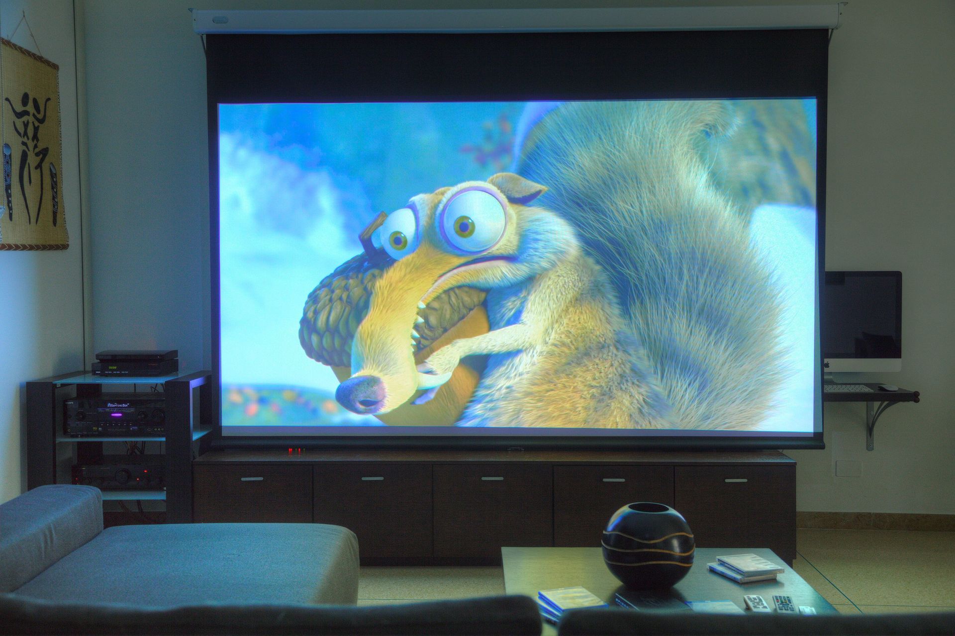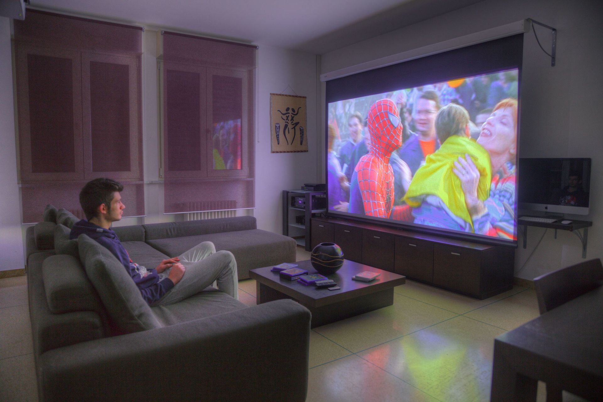 Spannendes Heimkino-System für Filme und Spiele: Großbildleinwand (2,5 Meter) mit Full-HD-Videoprojektor, leistungsstarkes Surround-Sound-System mit 6 Wandeinbaulautsprechern + 1 Subwoofer für kinoähnliche Basseffekte.