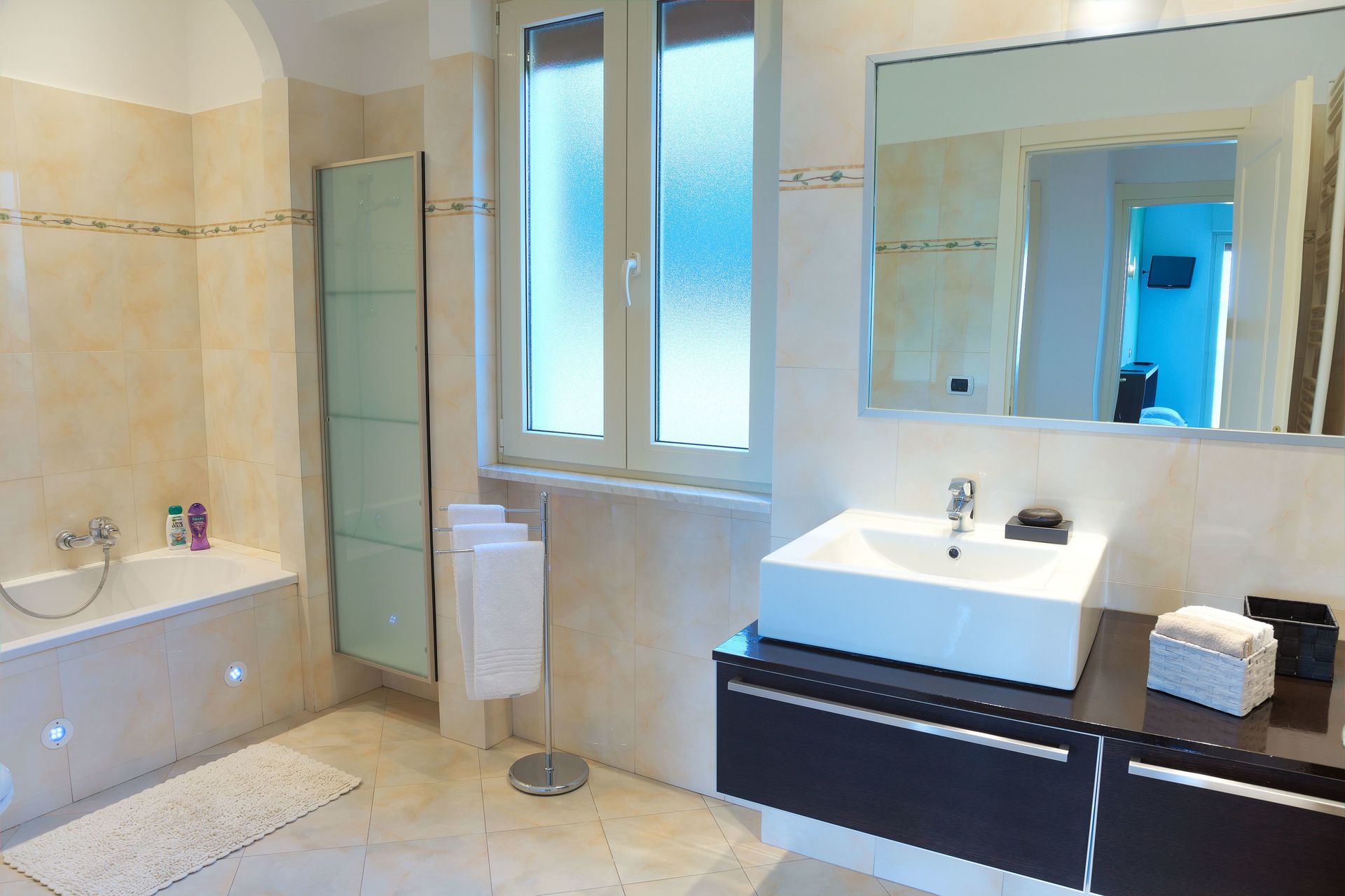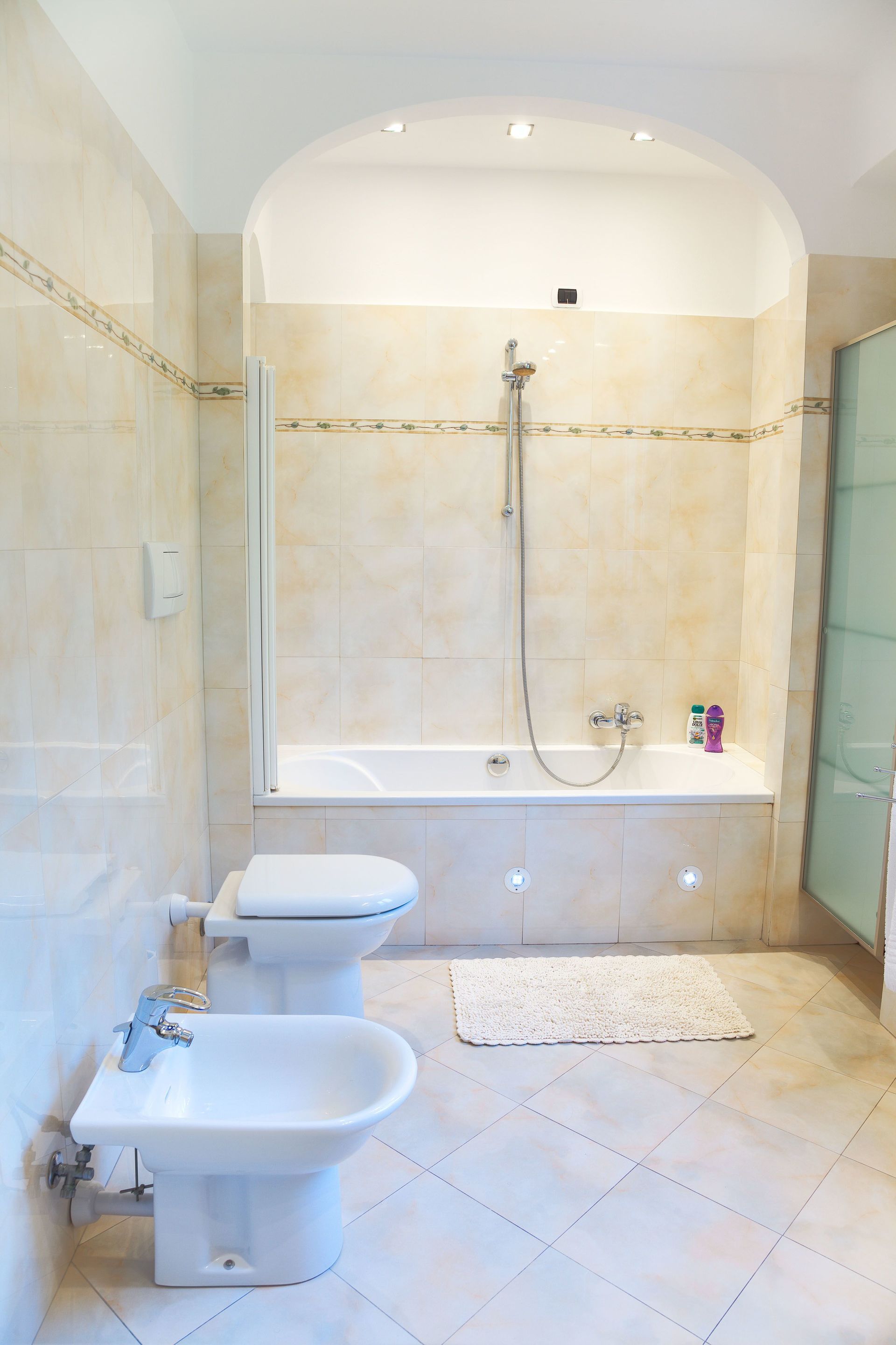Das Hauptbadezimmer: Badewanne + Dusche, Toilette, Bidet, Waschbecken und großer Spiegel.