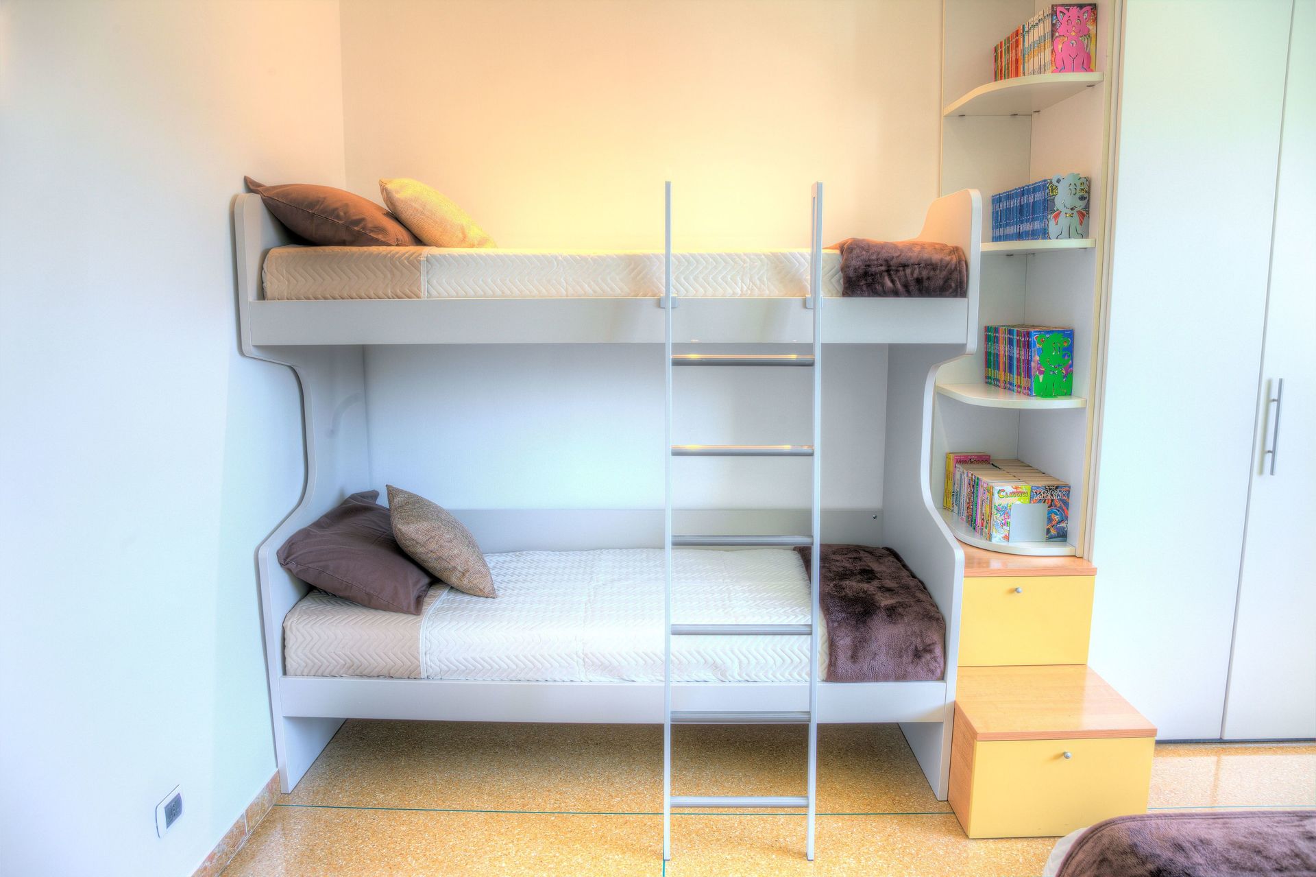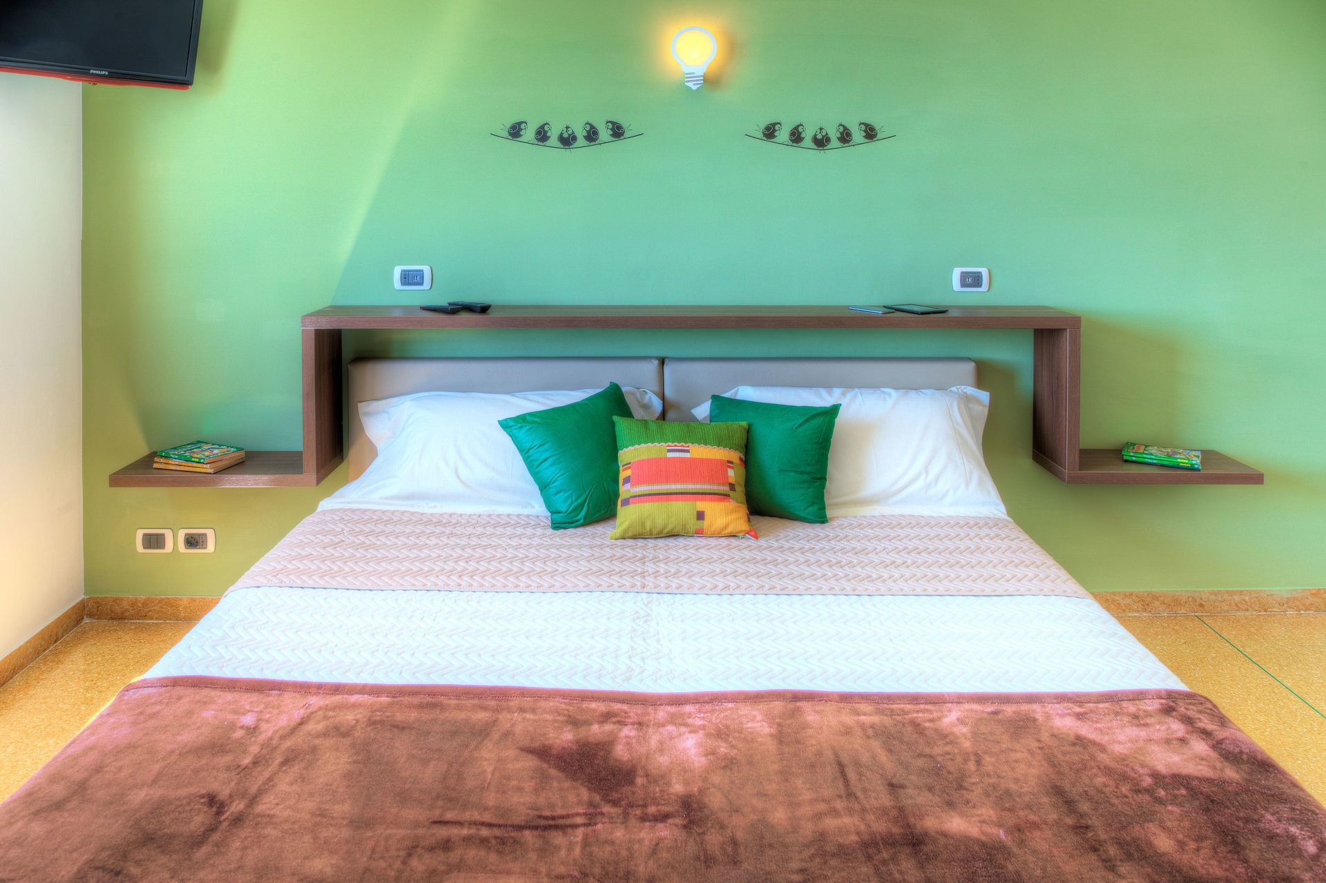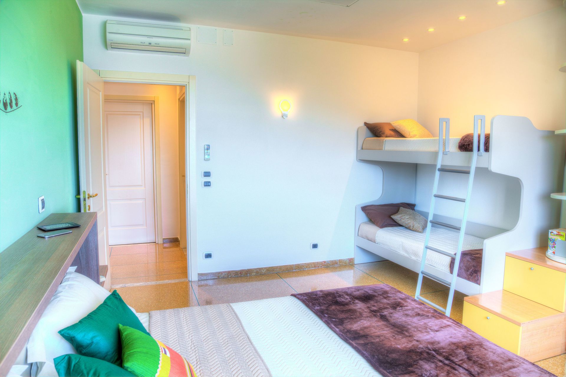 Kinderzimmer (das grüne Schlafzimmer): Es gibt zwei Einzelbetten (die zu einem Doppelbett zusammengestellt werden können) sowie ein Etagenbett (zwei Einzelbetten).