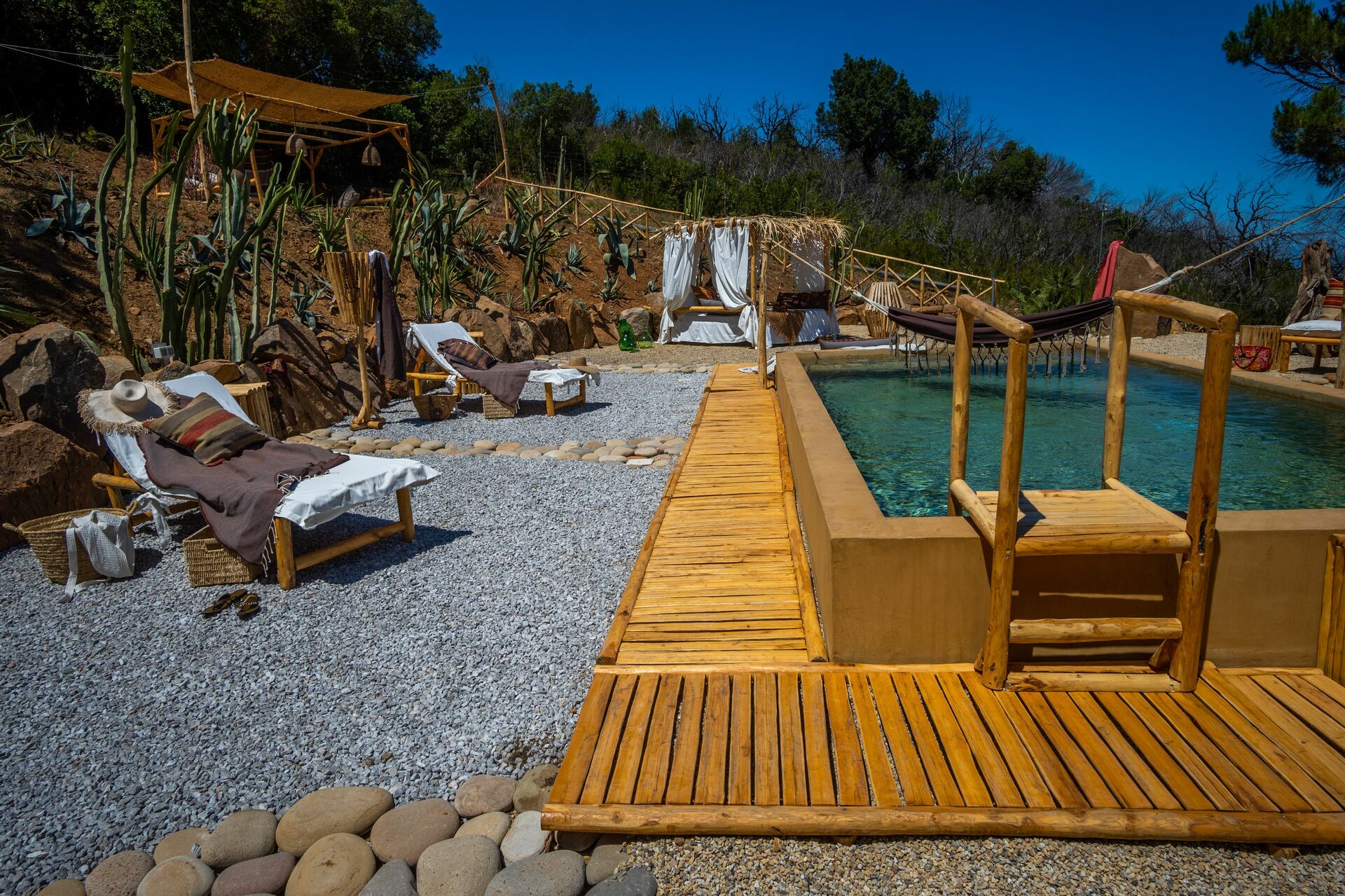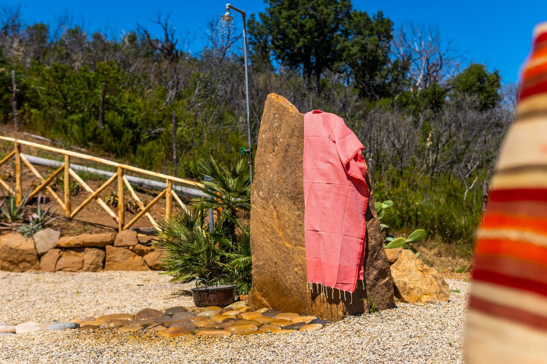 Sonnenterrasse (2000 m2): Dusche, Gartenmöbel, fünf Sonnenliegen.