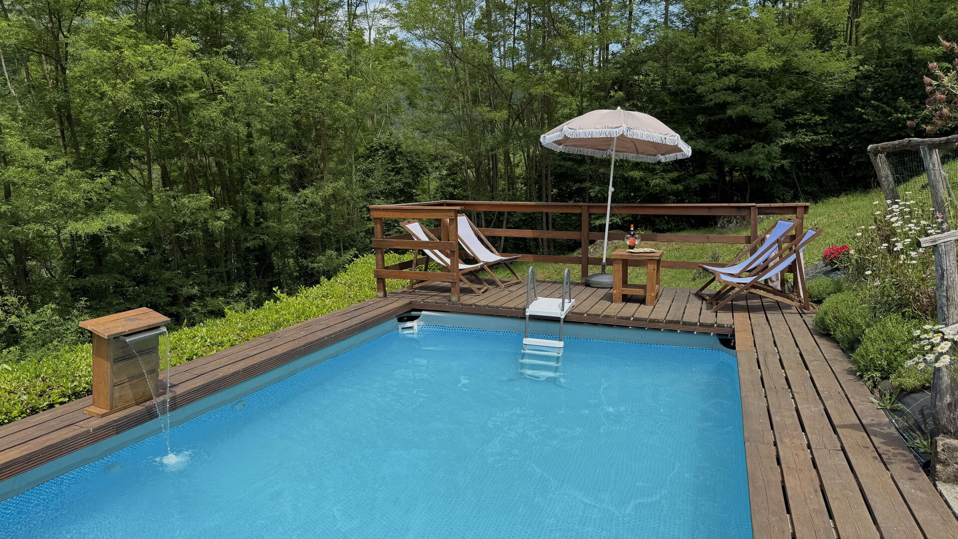 Garten: Schwimmbad (Breite: 3.8m, Länge: 7.3m, Tiefe: 1.2m), Grill, Außenbereich für das Essen im Freien, Gartenmöbel, vier Sonnenliegen.