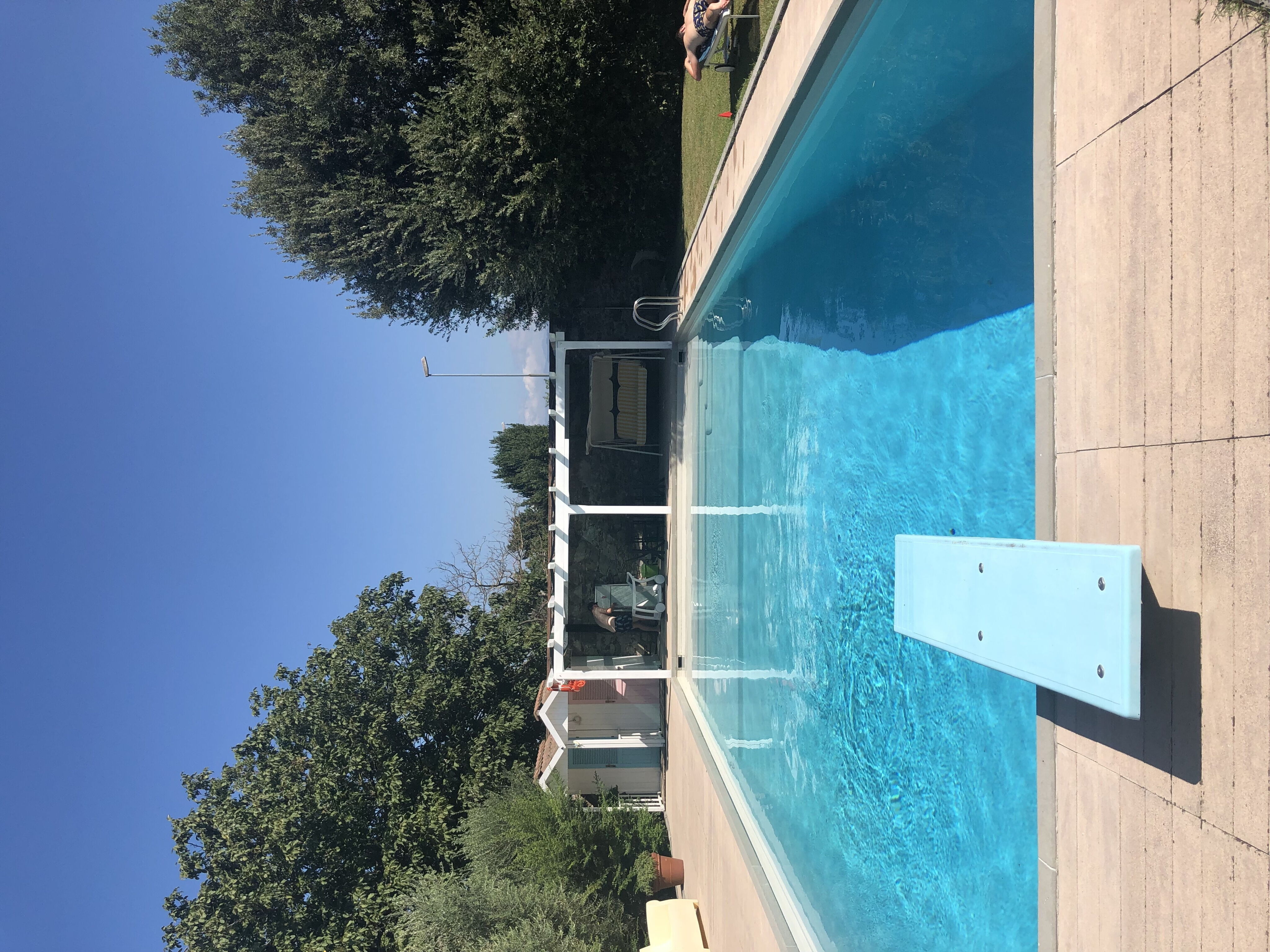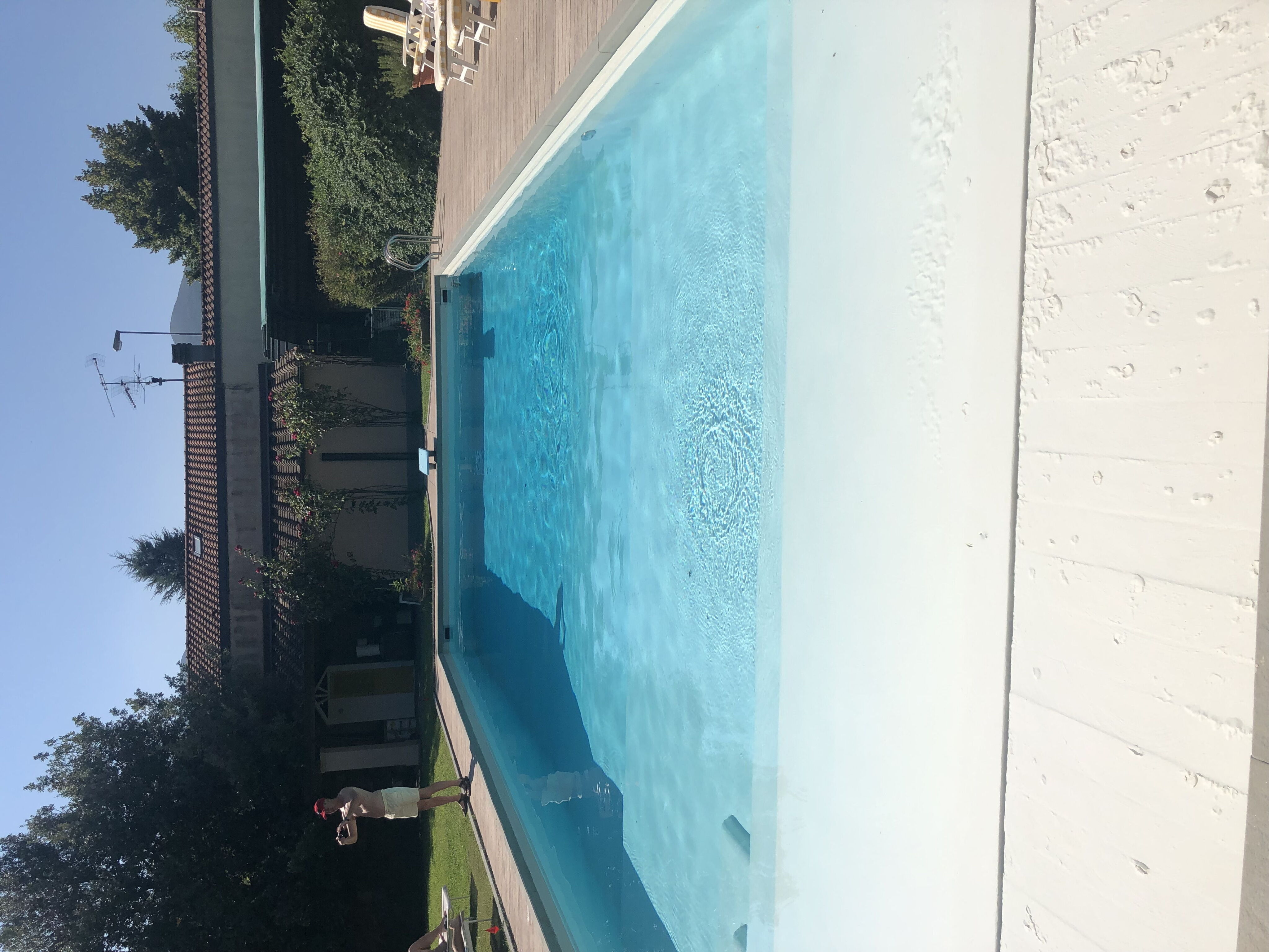 Das superschöne Schwimmbad (16 x 6m, tief von 10 cm – 3m) liegt im Garten der Besitzer, welcher mittels einem elektr. Tor erreicht werden kann. Die Gäste können das Schwimmbad exklusiv von 09:00h bis 17:00h nutzen (Danach benützen es eventuell auch die Besitzer). Ihre Kinder können wunderbar im wenig tiefen Bereich des Bades planschen – mit Luftmatratzen und aufblasbaren Tieren, welche die Besitzer zur Verfügung stellen. Der Bereich um das Schwimmbad ist mit Liegebetten, Liegestühlen, Tisch, Stühlen, Hollywoodschaukel, 2 Umkleidekabinen, Gäste-WC, Kühlschrank, Dusche (warm und kaltes Wasser) und einem Rasen vom 1000 qm ausgestattet, alles zur exklusiven Nutzung für die Gäste.
