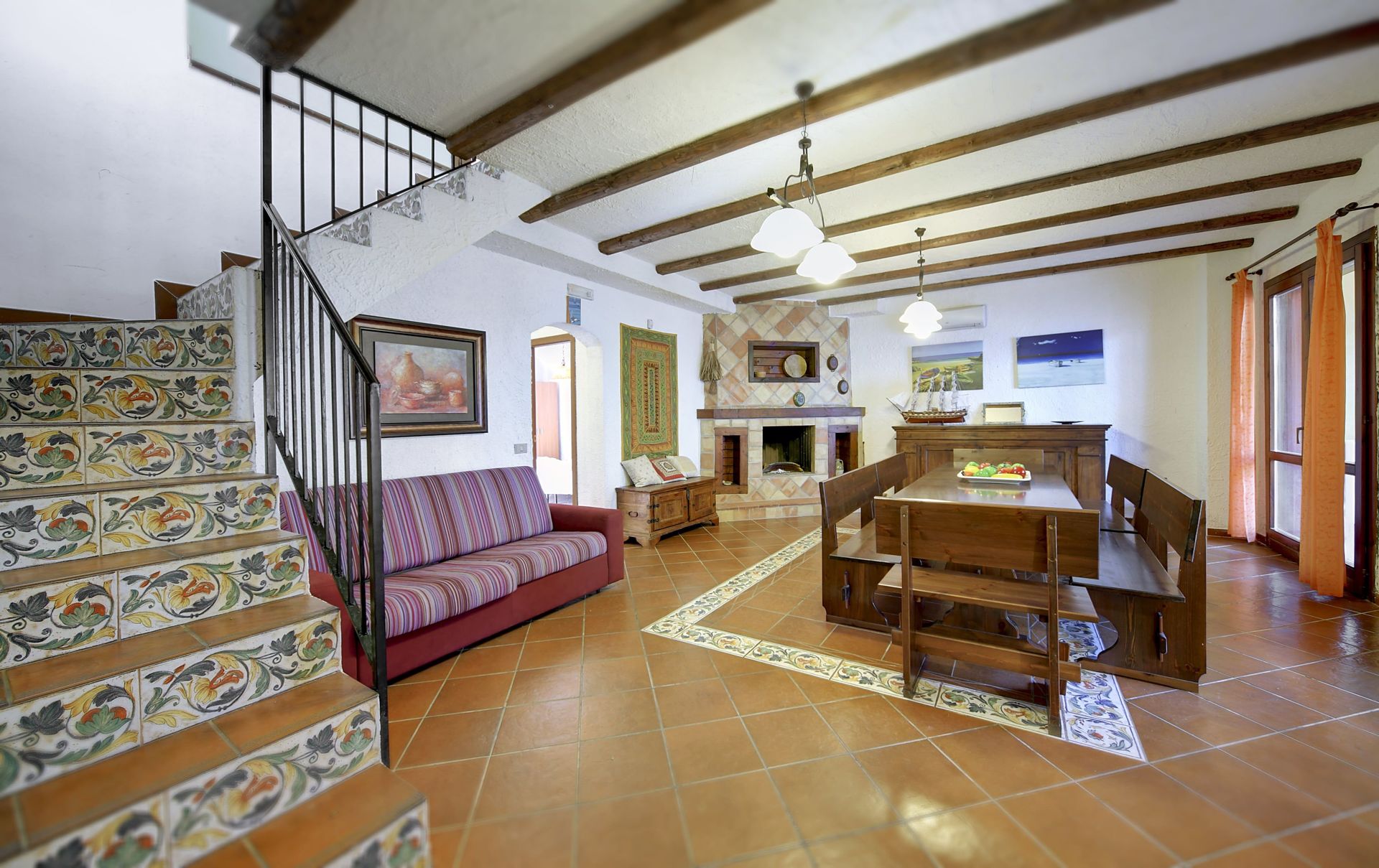 Wohnzimmer (25 m2): Kamin, Esstisch, Doppel-Schlafsofa, WiFi Internet, Klimaanlage, Ausgang auf die Veranda.