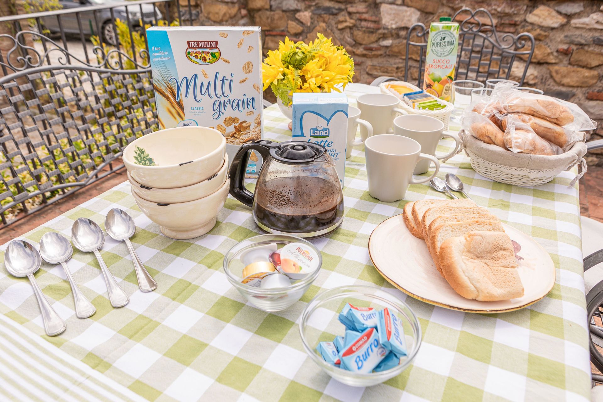 Der Willkommens-Korb ist außerdem voll mit Cornflakes, Saft, Kaffee, Tee, Milch und Zucker.