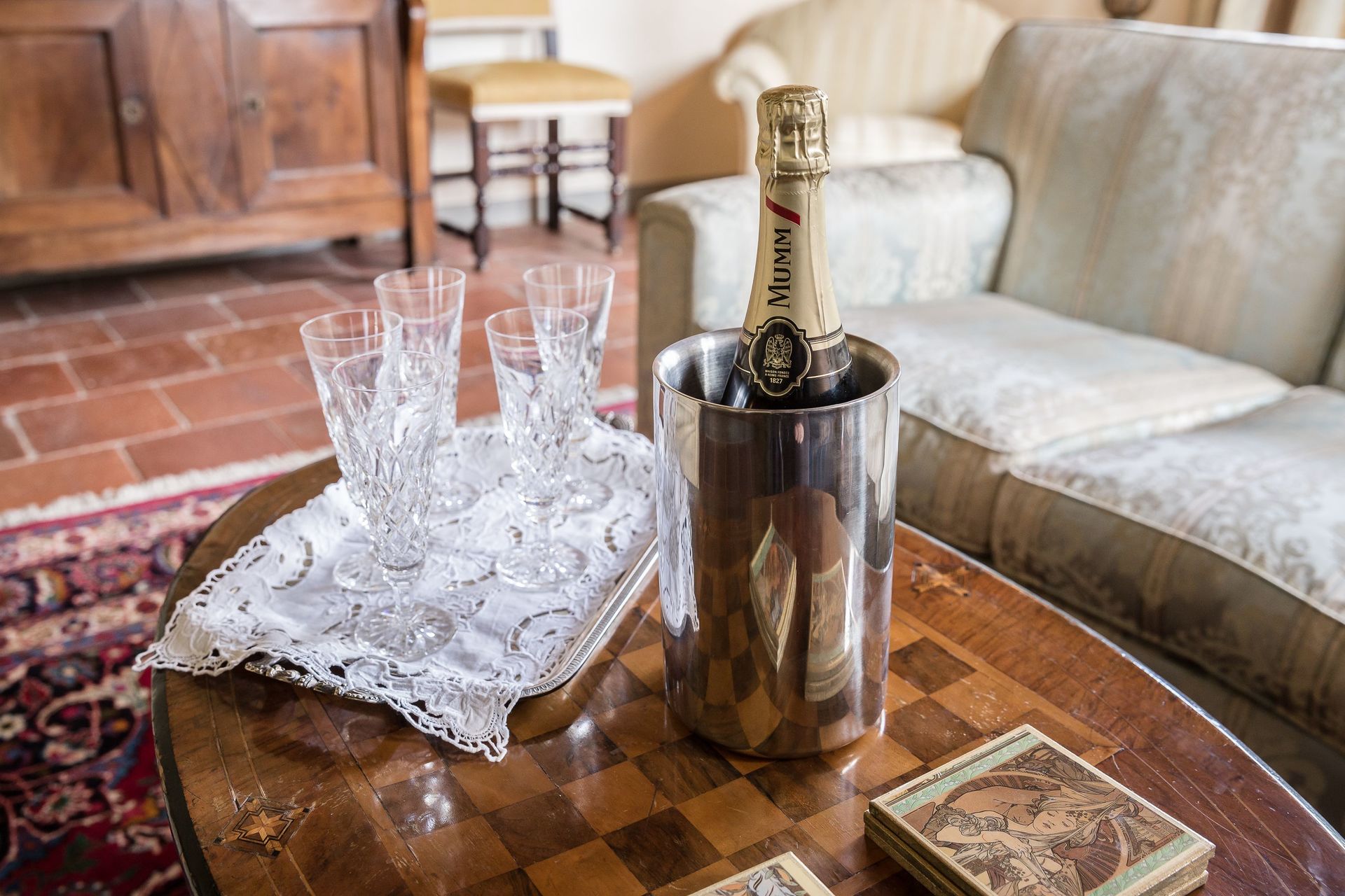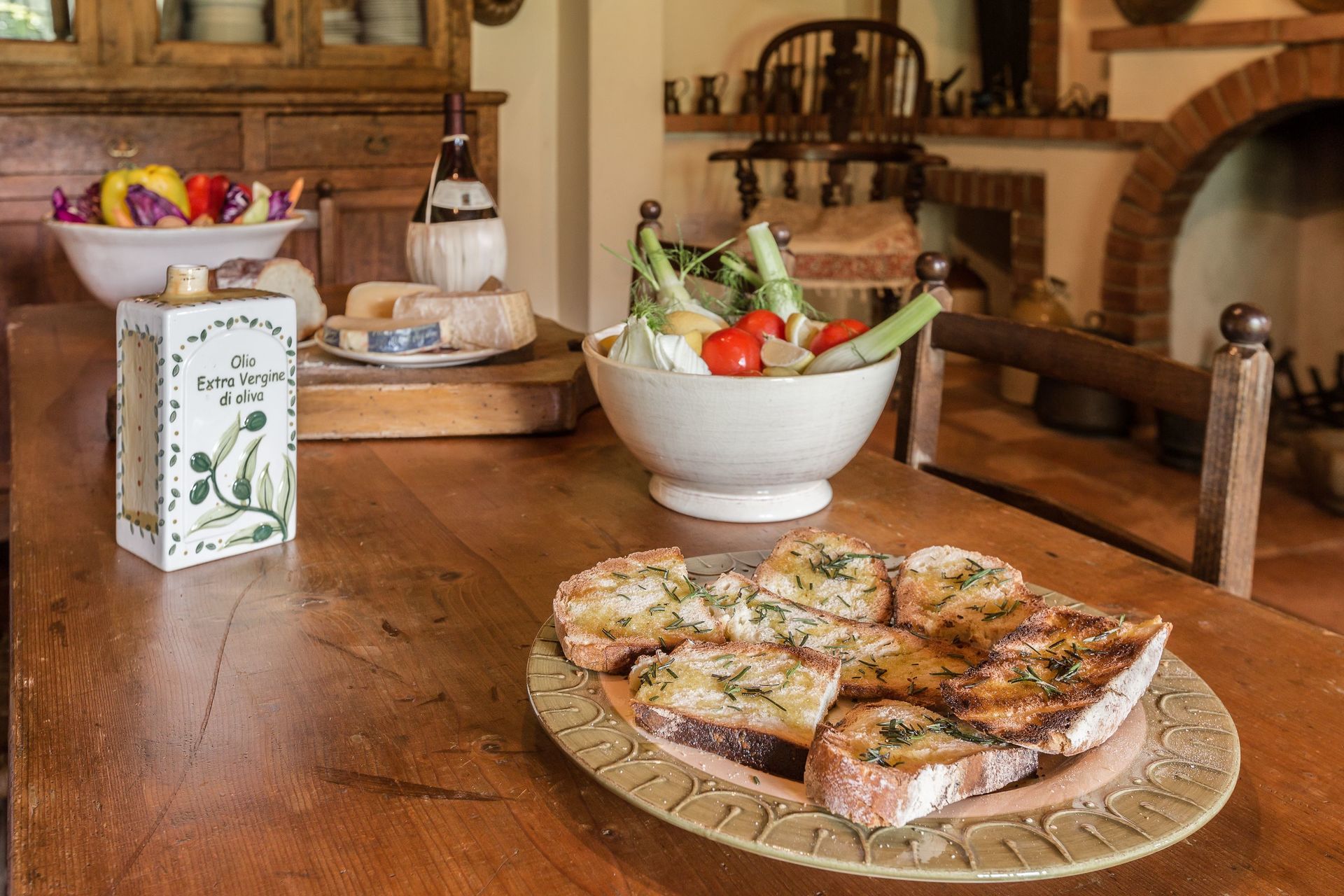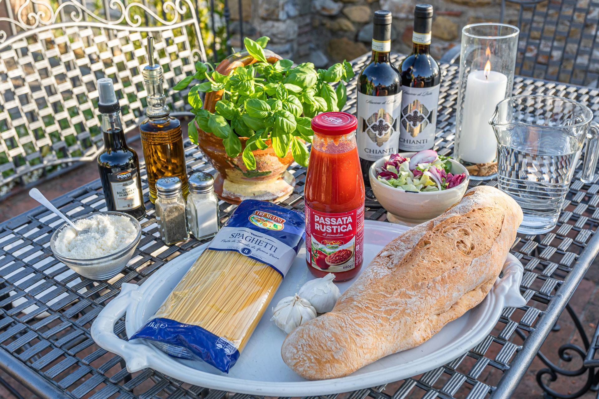 Allem was Sie für Ihr erstes Abendessen am Ankunftstag benötigen: hausgemachte Pasta, Parmesan, Brot und Salat, Chianti Wein und Wasser;