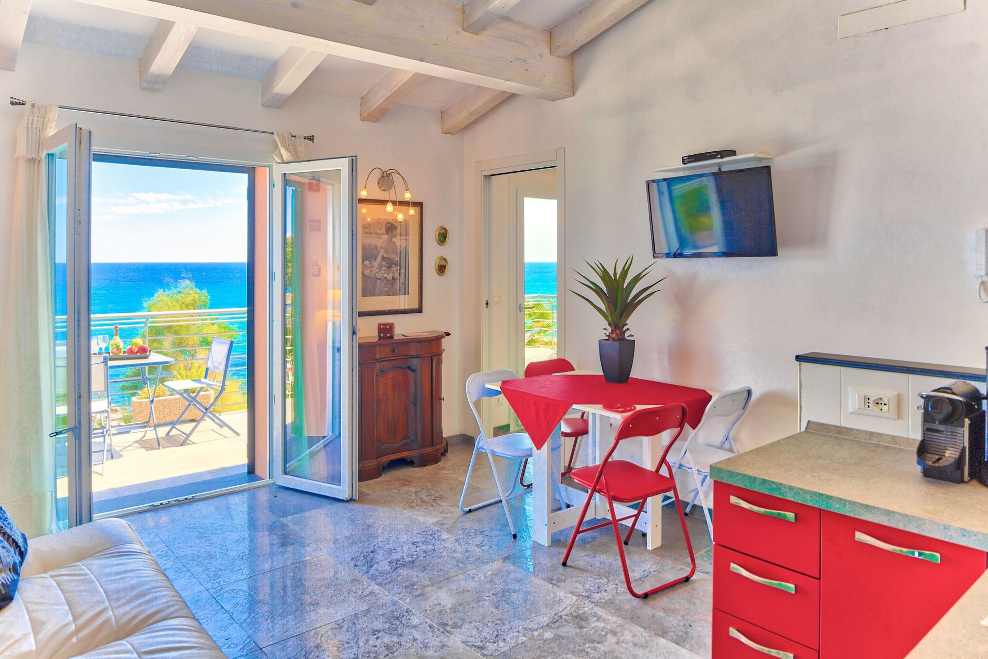 Die Wohnung befindet sich im ersten Stock und verfügt über eine große Panoramaterrasse mit herrlichem Meerblick.