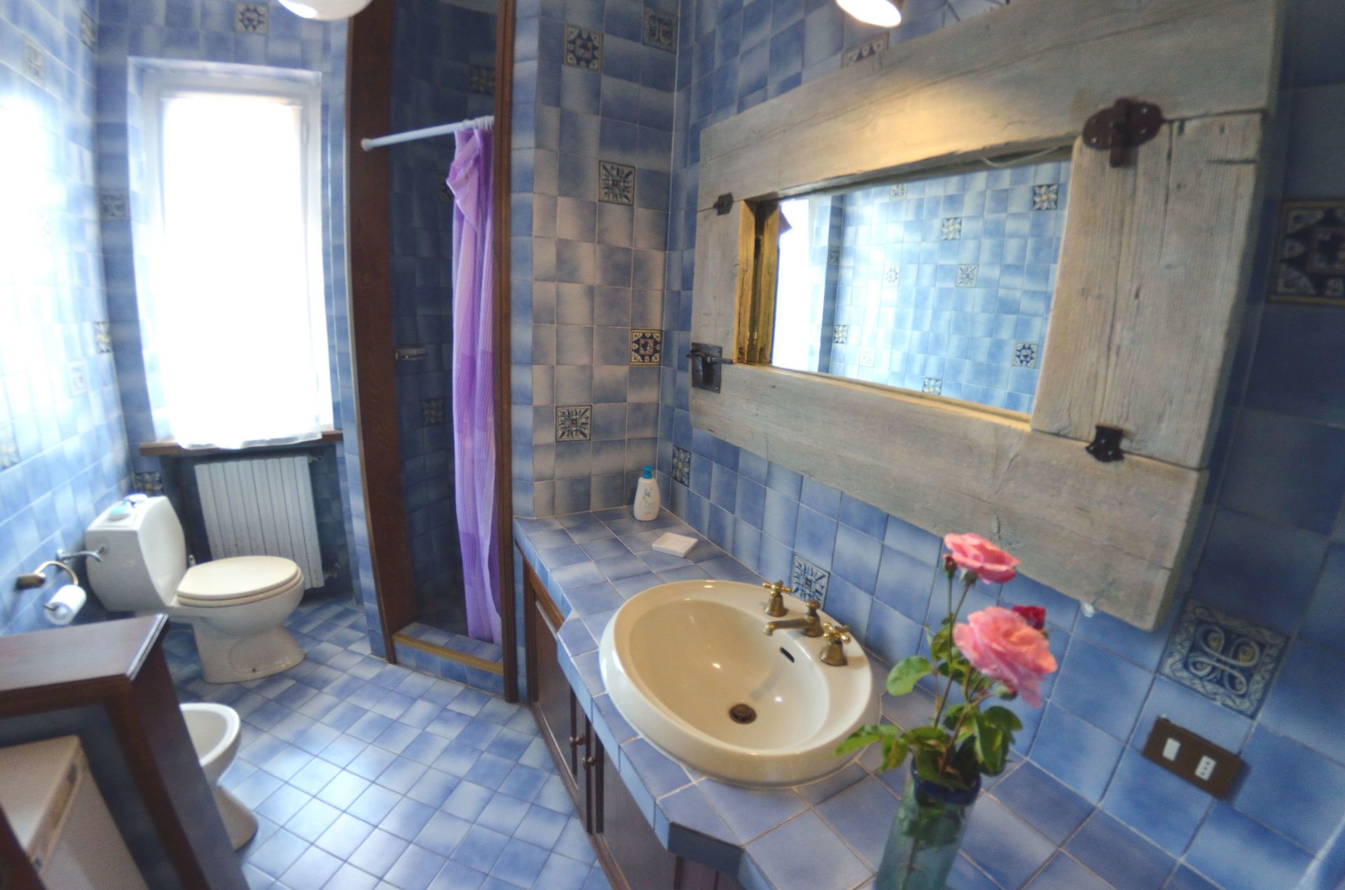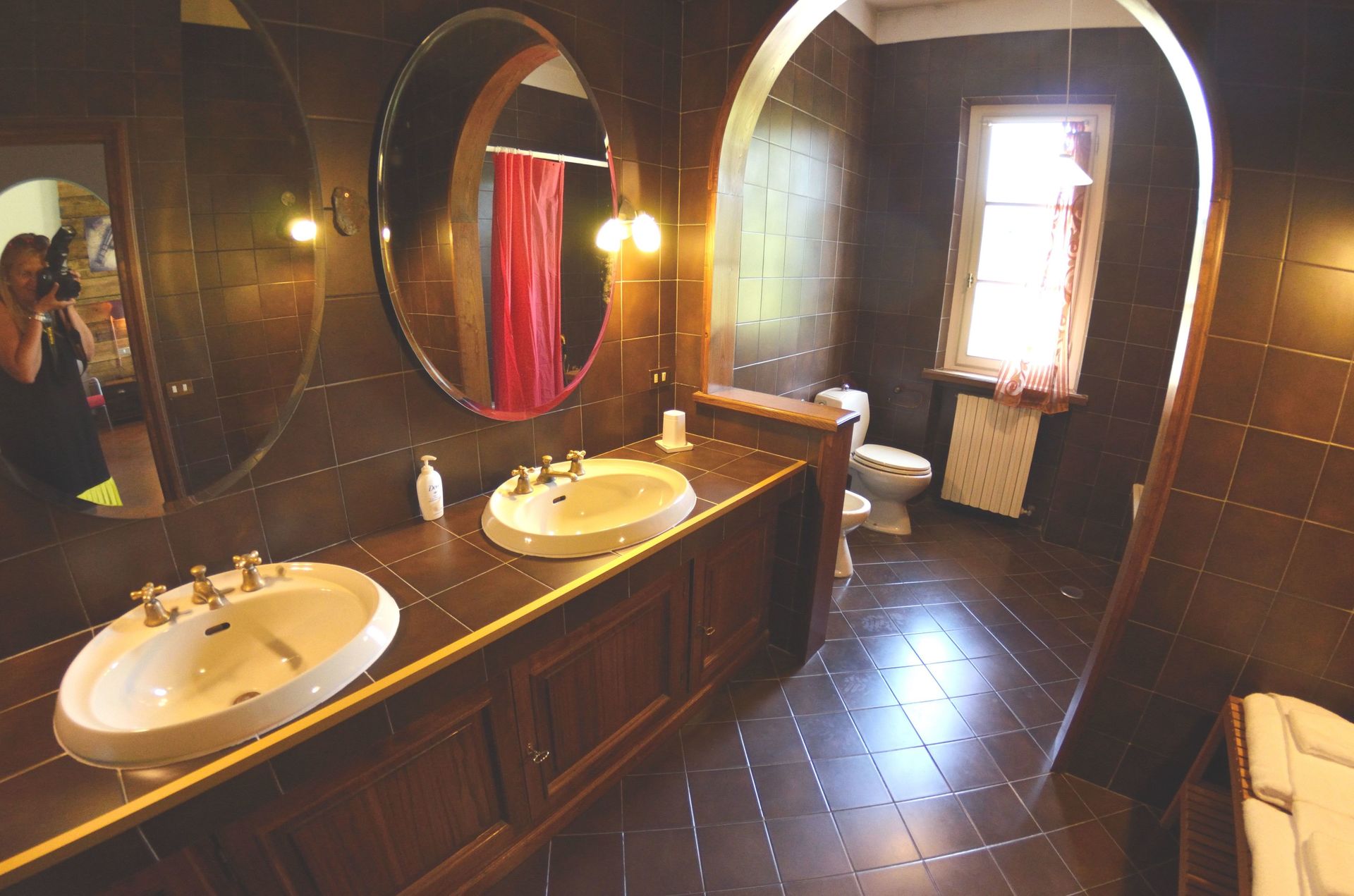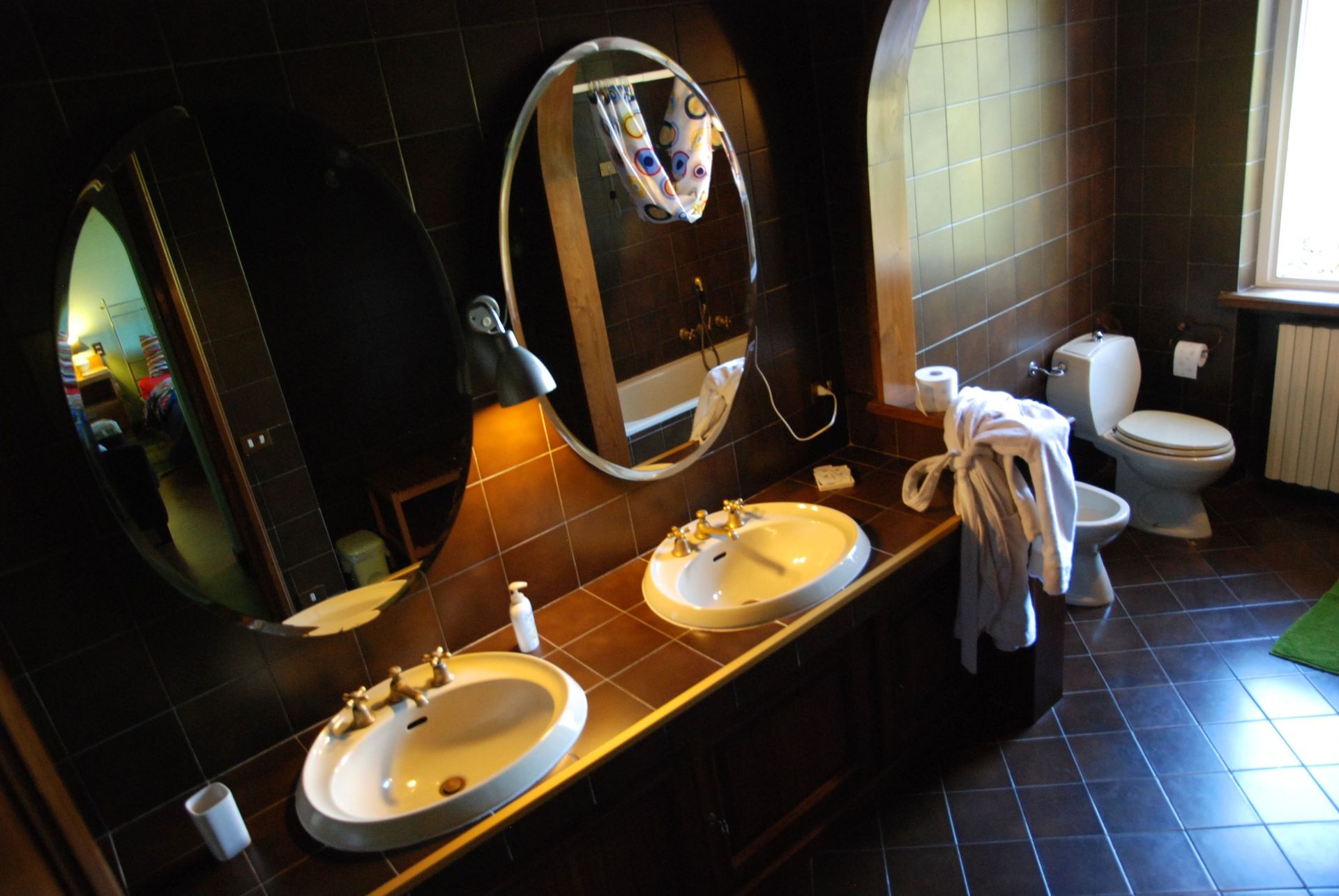 Badezimmer 2: zwei Waschbecken, WC, Bidet, Badewanne, Dusche.
