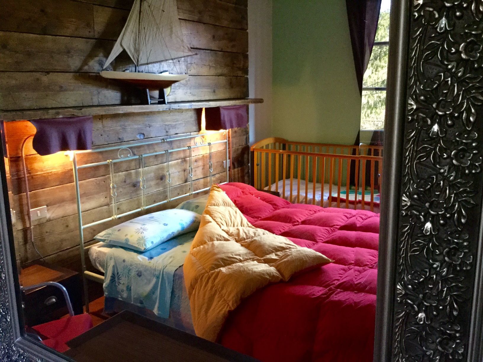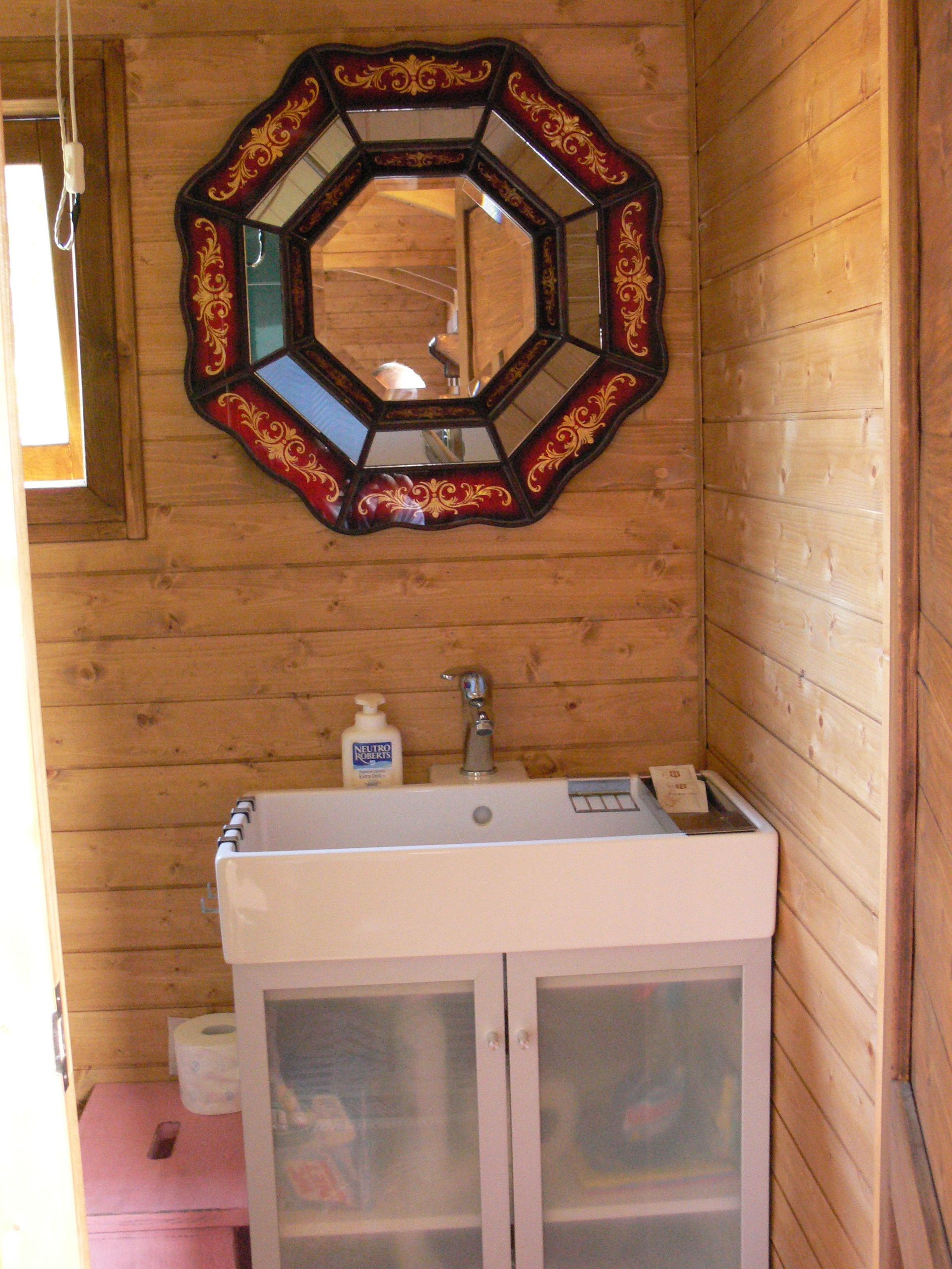 Im Garten, im Schatten der Bäume, steht ein alter, klassischer Wohnwagen, der 1 Schlafzimmer hat und als extra Schlafplatz genutzt werden kann. Er ist mit einer kleinen Küchenzeile, dem Schlafplatz und einem Badezimmer ausgestattet. – GRATIS VERFÜGBAR –