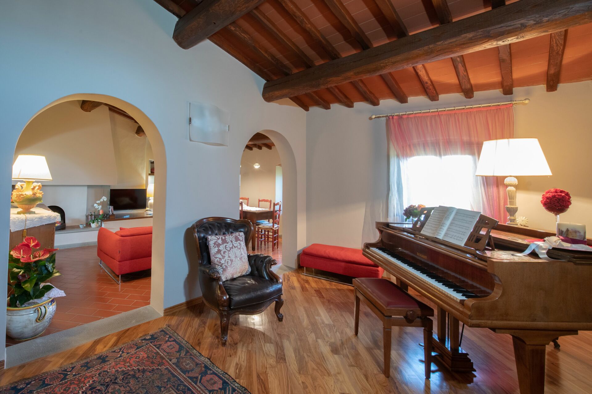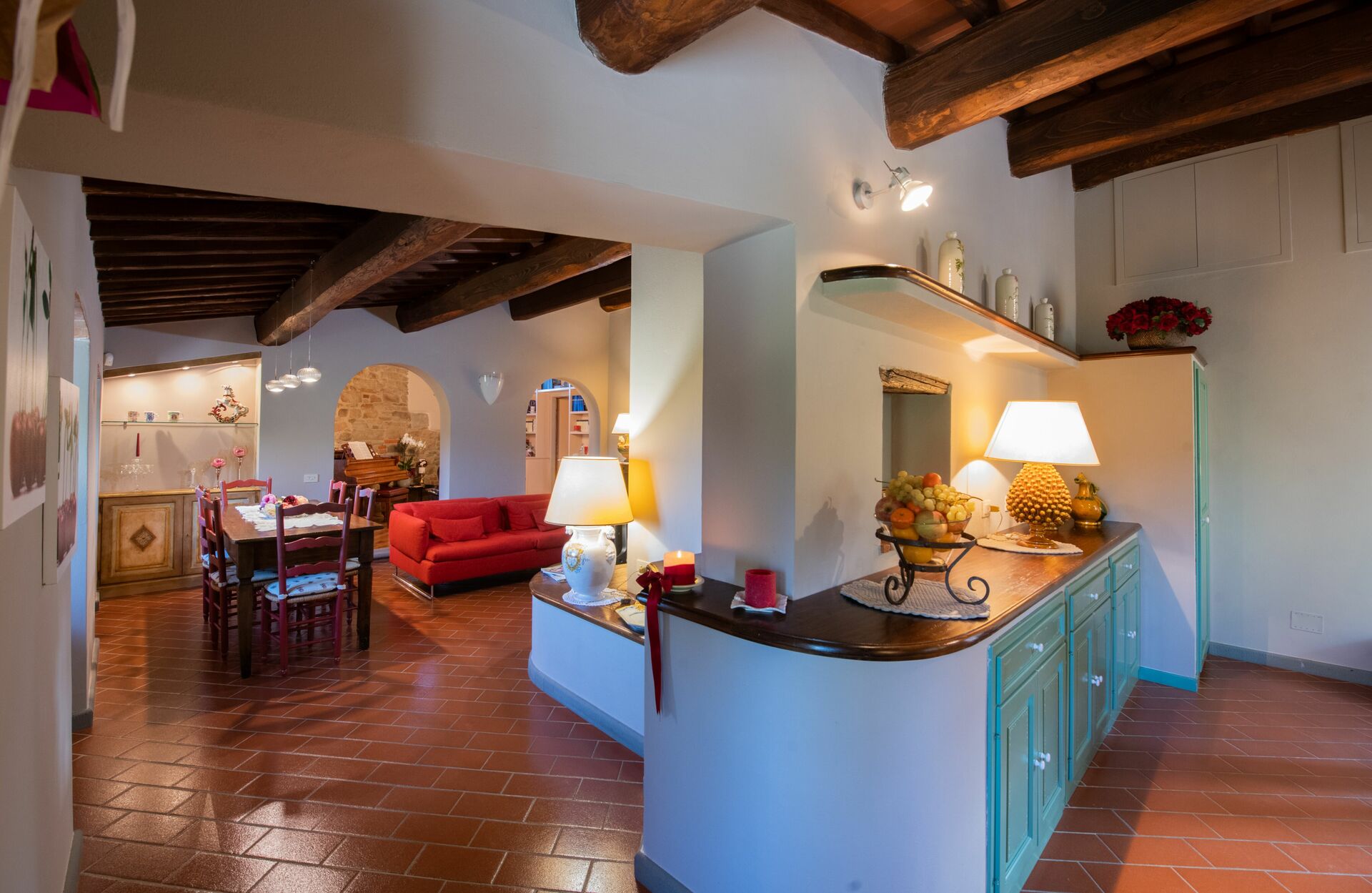 Bei Ankunft werden Sie eine reizende, saubere und gut gepflegte Unterkunft finden, mit Ausblick auf der Hügel perfekt für einen erholsamen Toskana-Urlaub. Nach einem ereignisreichen Tag, den Sie mit Sightseeing verbracht haben, können Sie mit Familie und Freunden am Pool ein schönes, kühles Glas Wein genießen - einfach perfekt, um den Tag ganz ausgeruht ausklingen zu lassen. Im Außenbereich können Sie einen Spielplatz und einen Grill nutzen. Essen mit Freunden und Familie ist ein großer Bestandteil der toskanischen Kultur. Nutzen Sie die Küche, um Mahlzeiten aus lokalen Produkten vorzubereiten, während Sie im Urlaub sind. Die Küche kommt mit Kaffeemaschine, Mikrowelle, Toaster und Kühlschrank, sowie ausreichend Geschirr und Besteck für bis zu 14 Personen. Speisen Sie 'al Fresco' wie ein echter Toskaner - die komplett eingerichtete Veranda ist eine erstklassige Kulisse, um das Essen, die Familie und das schöne toskanische Wetter zu genießen.