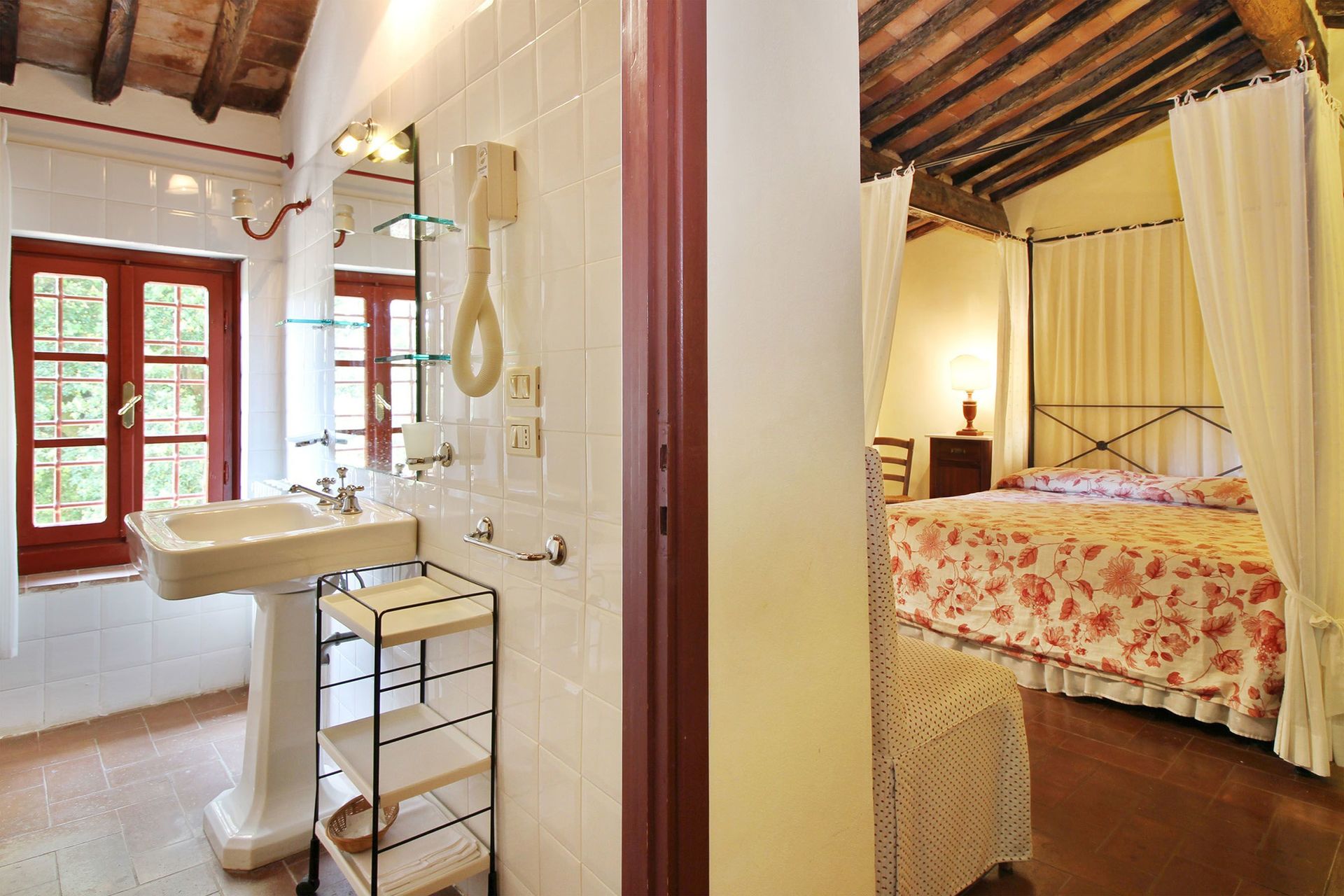 Schlafzimmer mit Bad: Doppelbett, WiFi Internet, Klimaanlage, Waschbecken, WC, Bidet, Dusche, Fön, Ausgang auf den Garten.