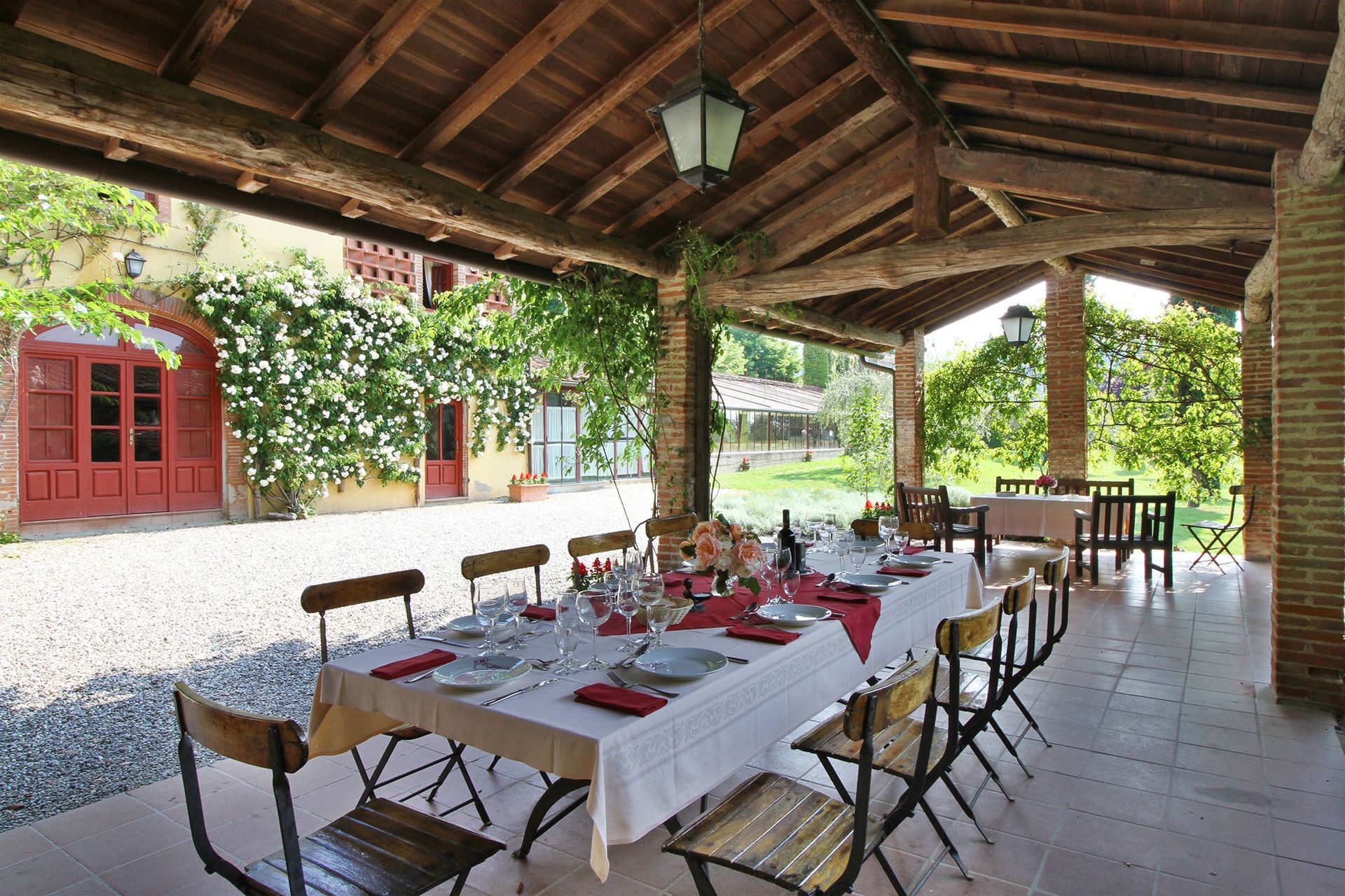 Garten (500 m2): Schwimmbad (privat, Breite: 6m, Länge: 12m, Tiefe: 1.5m, Außen), Dusche, Grill, Außenbereich für das Essen im Freien, Esstisch (Personen: 12), Gartenmöbel, sechs Sonnenliegen, Kinderspielplatz, Tennisplatz.