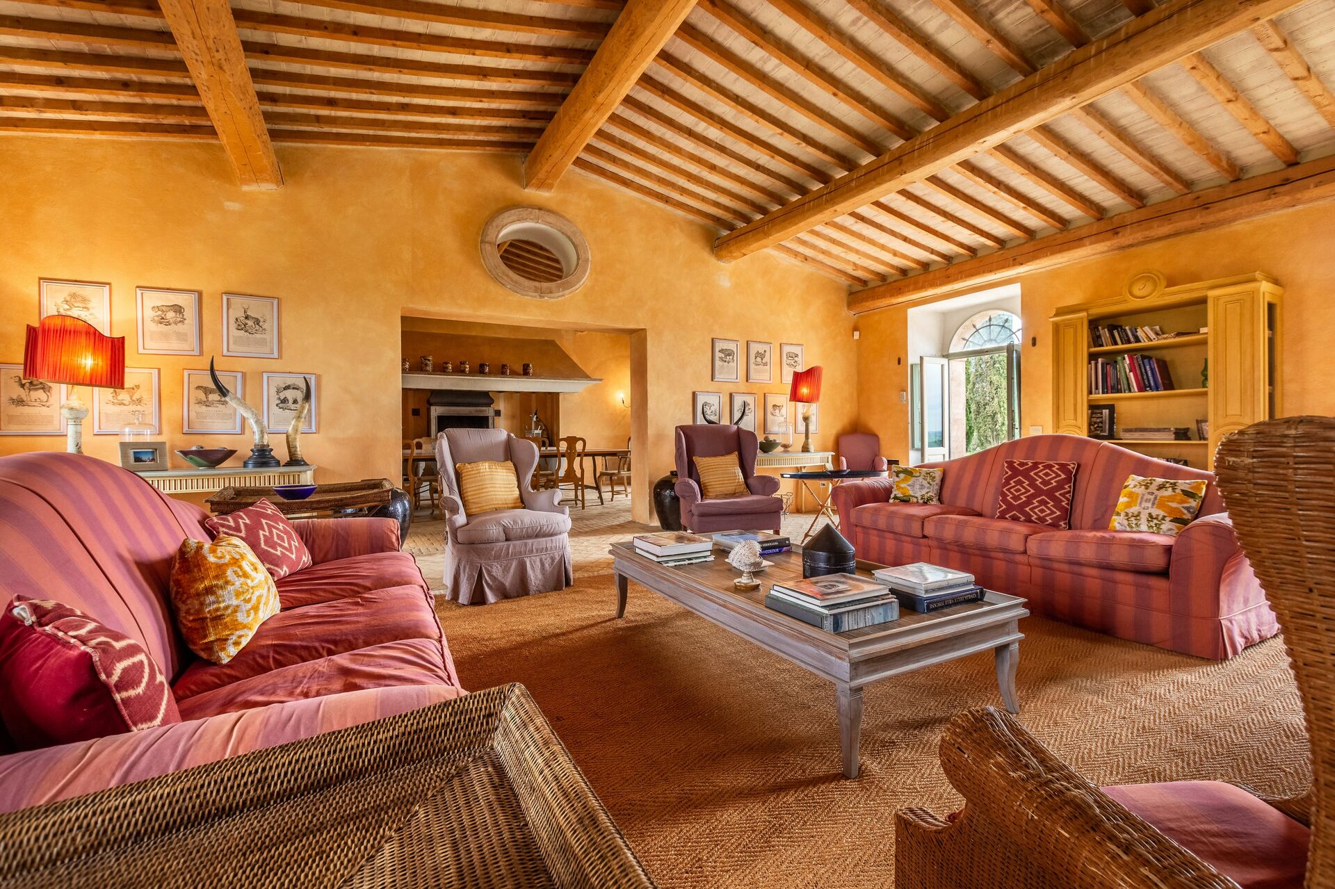 Wohnzimmer 1: zwei Sofas (Personen: 6), vier Sessel, Kamin, WiFi Internet, TV, Video / DVD, Stereoanlage, Ausgang auf den Garten, Ausgang auf den Patio.