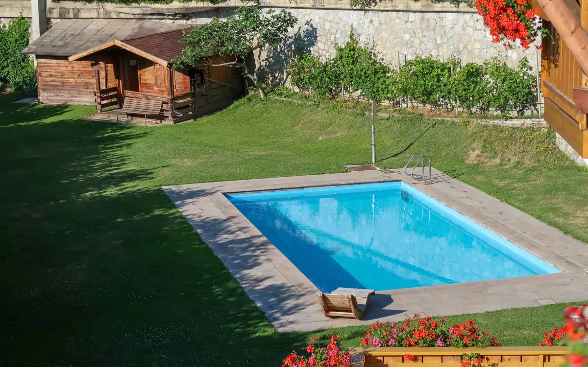 Der terrassierte Garten ist eingezäunt und bietet gepflegte Rasenflächen sowie Bäume, die schattige Bereiche schaffen. Eine Liegewiese steht zum Sonnenbaden zur Verfügung. Der Swimmingpool misst 10 x 5 Meter und ist vom 15. Mai bis 30. September für die gemeinsame Nutzung geöffnet. Eine Tischtennisplatte befindet sich im Außenbereich. Wanderwege beginnen nur 10 Meter vom Anwesen entfernt; Mountainbike-Möglichkeiten sind ebenfalls in unmittelbarer Nähe zugänglich.