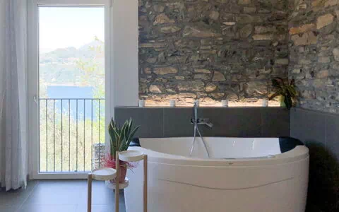 2-Zimmer-Haus 150 m2. Hell, modern und geschmackvoll eingerichtet: Wohn-/Schlafzimmer mit 1 Doppeldiwanbett (160 cm), Sat-TV. Ausgang zum Garten, zur Terrasse. 1 Doppelzimmer mit Panoramafenster mit Sprudelbad und Heizofen. Offene Küche (Backofen, Geschirrspüler, 2 Induktionskochplatten, Toaster, Wasserkocher, Mikrowelle, Tiefkühler, elektrische Kaffeemaschine) mit Esstisch (160 cm). Dusche/WC. E-Heizung, Solarheizung, Klimaanlage. Terrasse. Terrassenmöbel, Gartengrill, Liegestühle (4). Herrliche Sicht auf den See und die Berge. Zur Verfügung: Waschmaschine, Haartrockner. Bitte beachten: Nichtraucher-Unterkunft. Maximal 1 Haustier/Hund erlaubt. Zufahrt zum Haus bis auf ca. 150 m möglich. Der Gepäcktransport wird vom Eigentümer an den Ankunfts- und Abreisetagen von hier aus durchgeführt. IT097067B4BJPPK88V