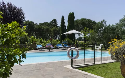 "Borgo Sacramento", 5-Zimmer-Haus 180 m2. Komfortabel und stilvoll eingerichtet: grosses Wohnzimmer mit offenem Kamin und Schwedenofen (nur Deko). Ausgang zur Terrasse. Wohnzimmer mit offenem Kamin und Küchenblock. 2 Zimmer, jedes Zimmer mit 1 franz. Bett, Dusche/WC und Klimaanlage. 1 Zimmer mit 1 Bett, 1 franz. Bett, Dusche/WC und Klimaanlage. 1 Zimmer mit 1 Bett, 1 Doppelbett und Klimaanlage. Grosse, offene Küche (Backofen, Geschirrspüler, 5 Flammen, Toaster, Wasserkocher, Mikrowelle, Tiefkühler, elektrische Kaffeemaschine) mit Esstisch. Dusche/WC. G-Heizung. Zur Verfügung: Waschmaschine, Bügeleisen, Fliegengitter, Kinderhochstuhl, Babybett bis 2 Jahre. Internet (Wireless LAN, gratis). Bitte beachten: Nichtraucher-Unterkunft. Bei Belegung mit weniger Personen als der maximalen Personenzahl steht das Nebengebäude nicht zur Verfügung. IT056034B5XXDP6O57