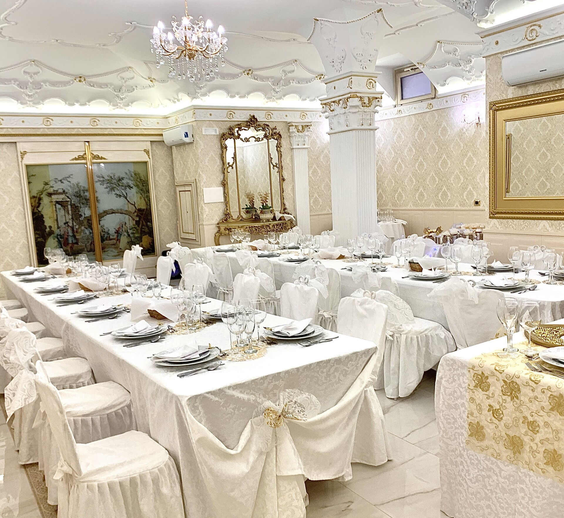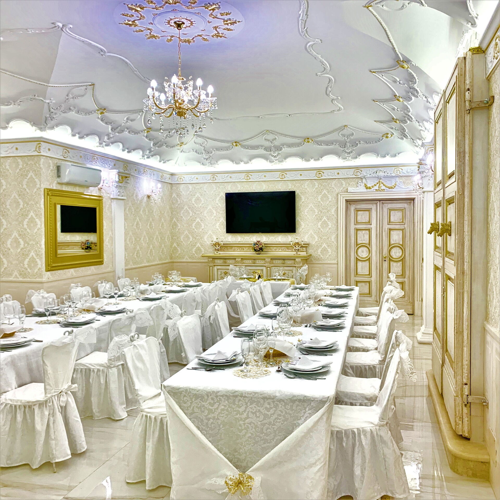 Esszimmer 1: zwei Esstische (Personen: 8), Klimaanlage, WiFi Internet, Kamin, Ausgang auf den Garten.