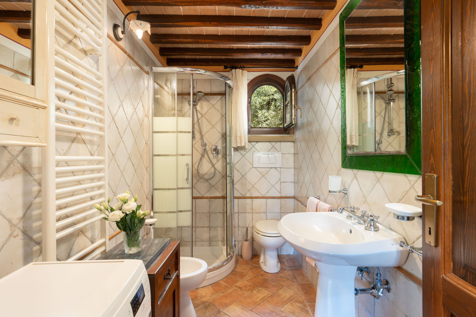 Badezimmer: Waschbecken, WC, Bidet, Dusche, Fön, Waschmaschine, WiFi Internet.