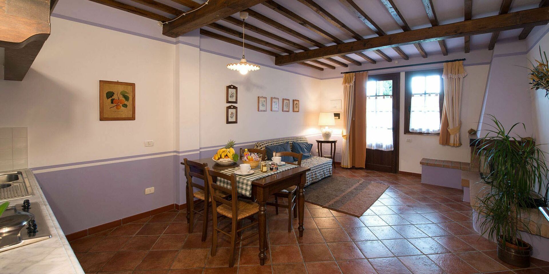 Erdgeschoss: Eingang zum Wohnzimmer (Satelliten-TV) und Kochecke (kleiner Backofen, Gefrierschrank) und Schlafsofa für 2 Personen, Bad mit Dusche, Doppelzimmer mit Ehebett und Balkon.
