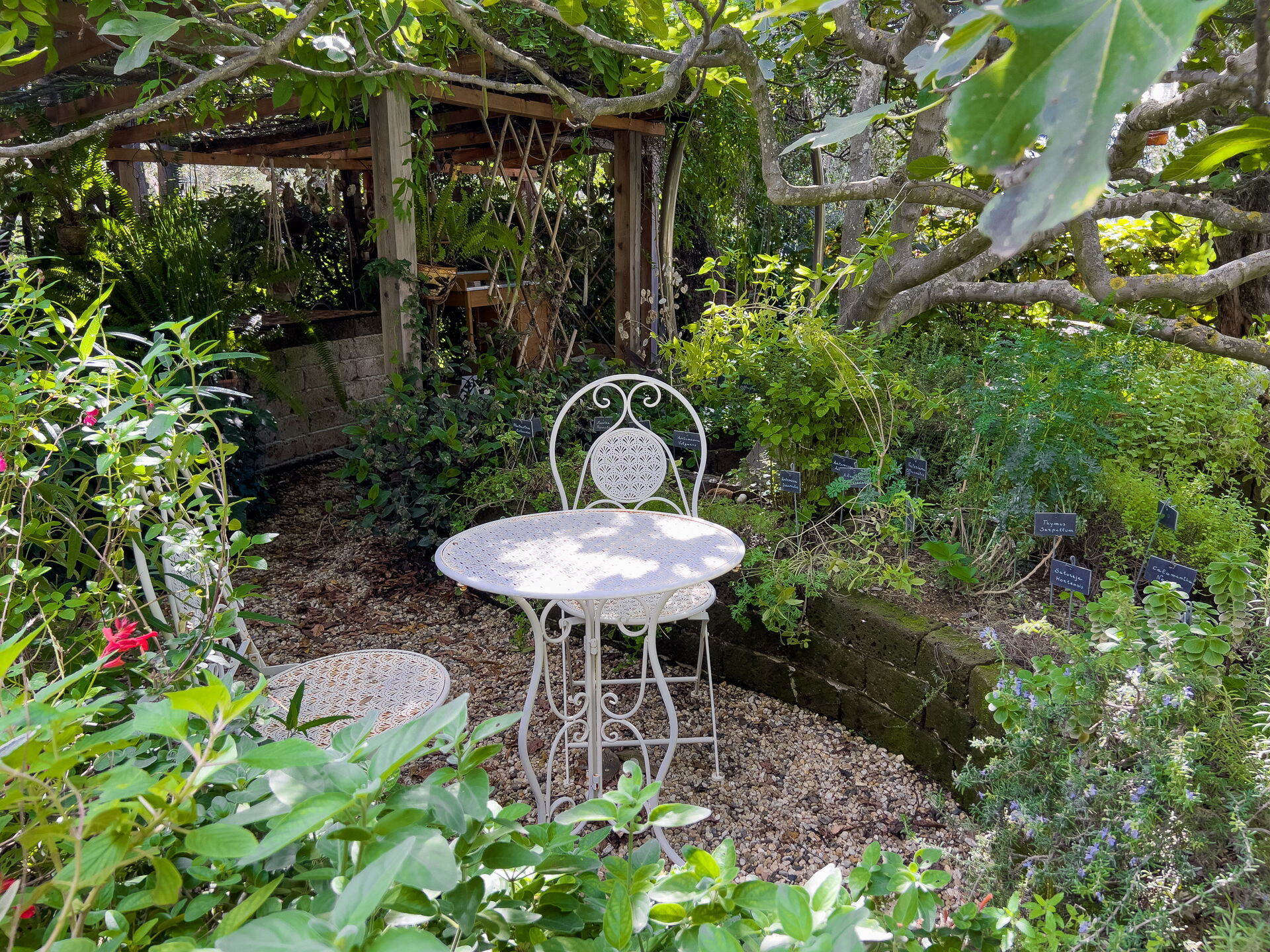 • a small botanical path. Beyond the pond, there is a secluded section of the garden with plants from all over the world. In this cool and shaded area there is a bistro table and chairs, a swing and a tuff fountain.