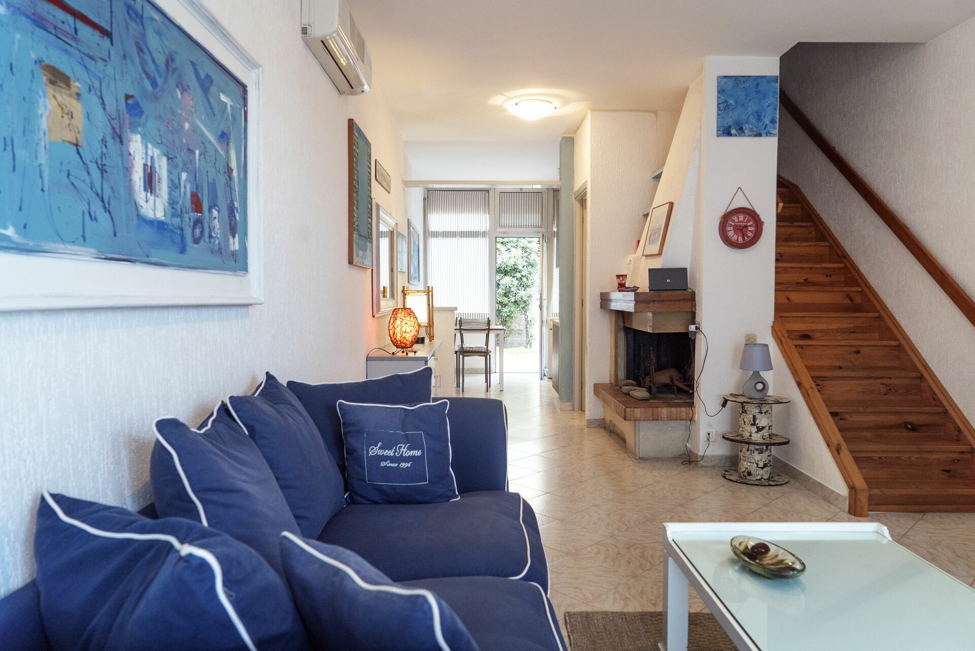 Wohnzimmer (20 m2): Sofa (Personen: 3), Kamin, WiFi Internet, Klimaanlage, TV, Ausgang auf den Garten.