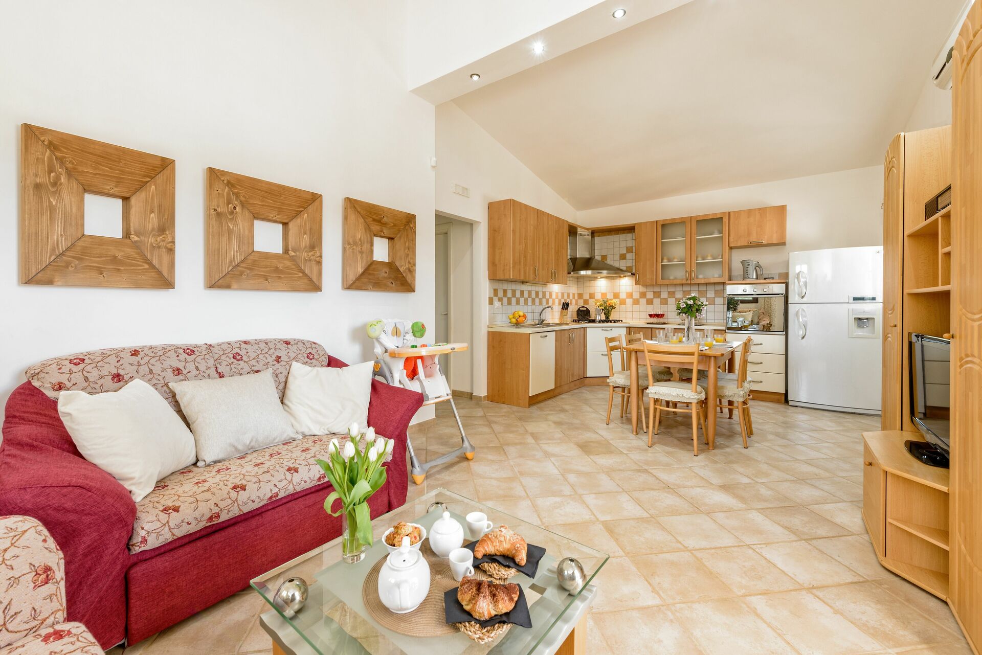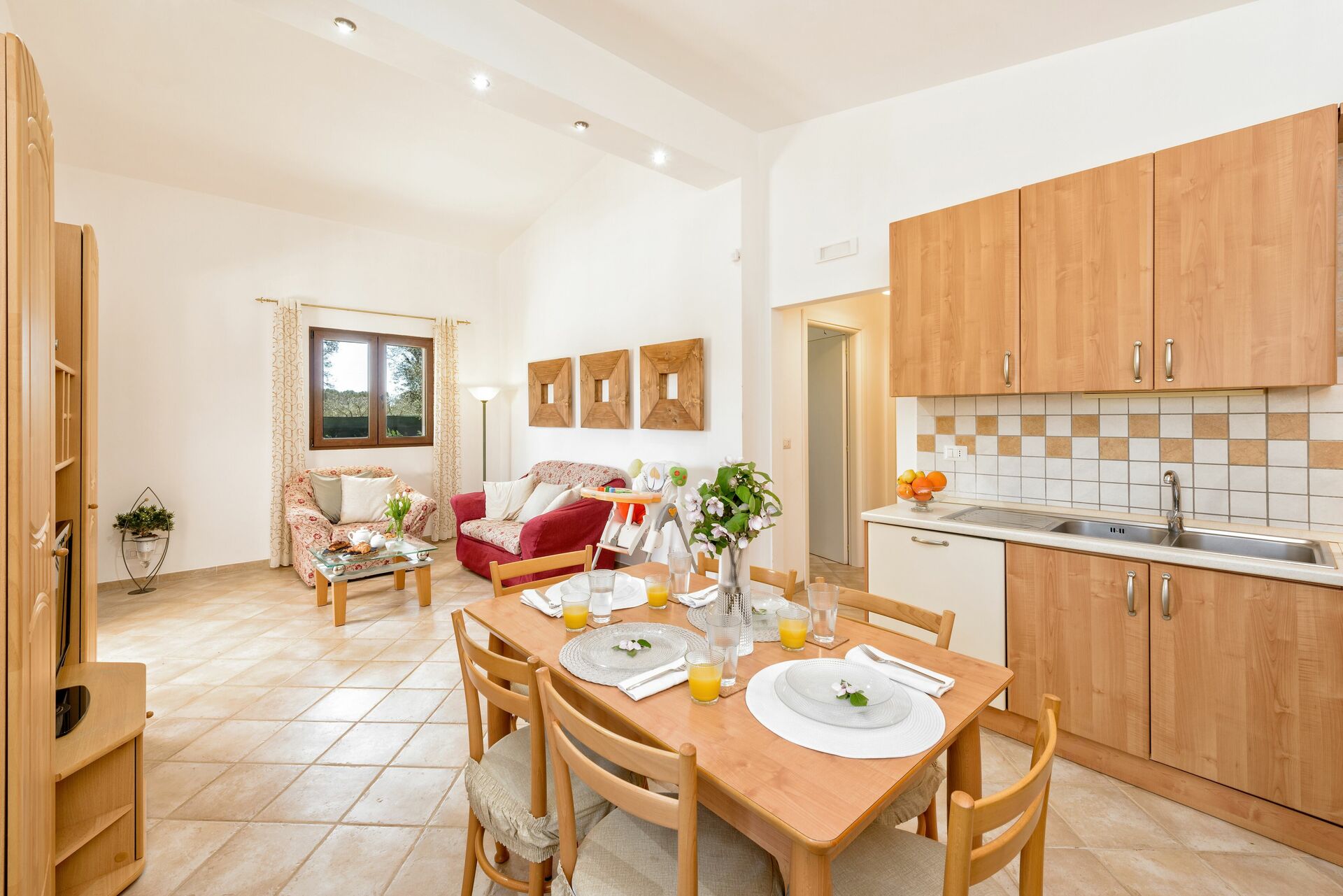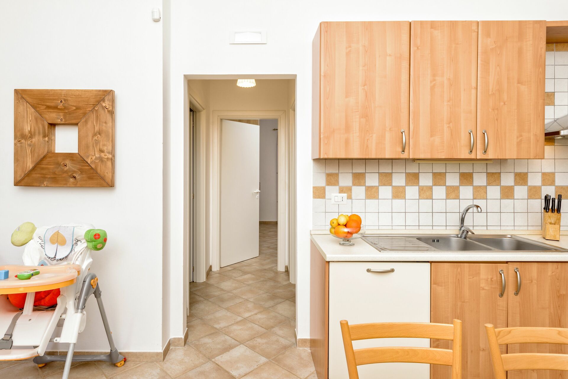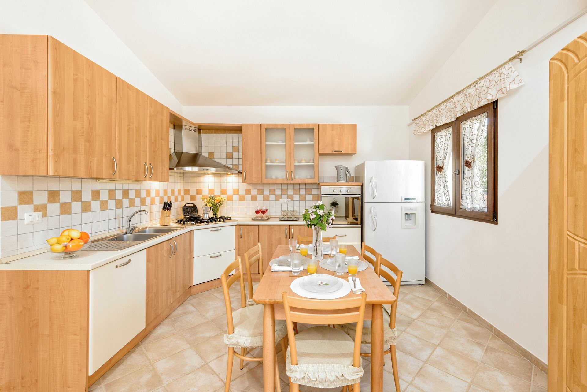Wohnküche: gut ausgestattete Küche, Esstisch, Kühlschrank, Tiefkühler, Herd, Ofen, Italienische Kaffeemaschine, Doppel-Schlafsofa, WiFi Internet, Klimaanlage, Kinderhochstuhl, TV, Ausgang auf den Garten, Ausgang auf den Patio.