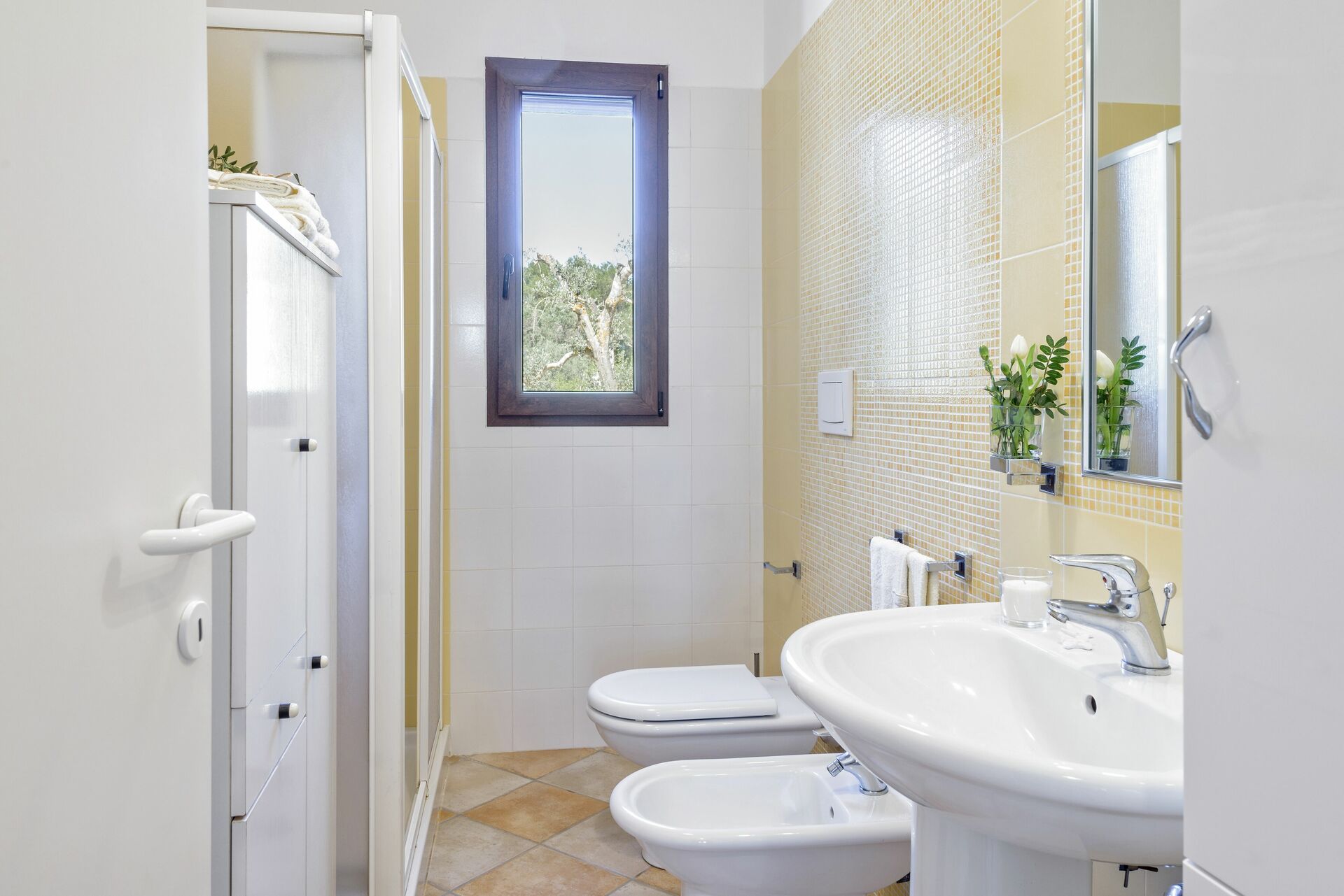 Badezimmer: Waschbecken, WC, Bidet, Dusche, Fön, Waschmaschine.