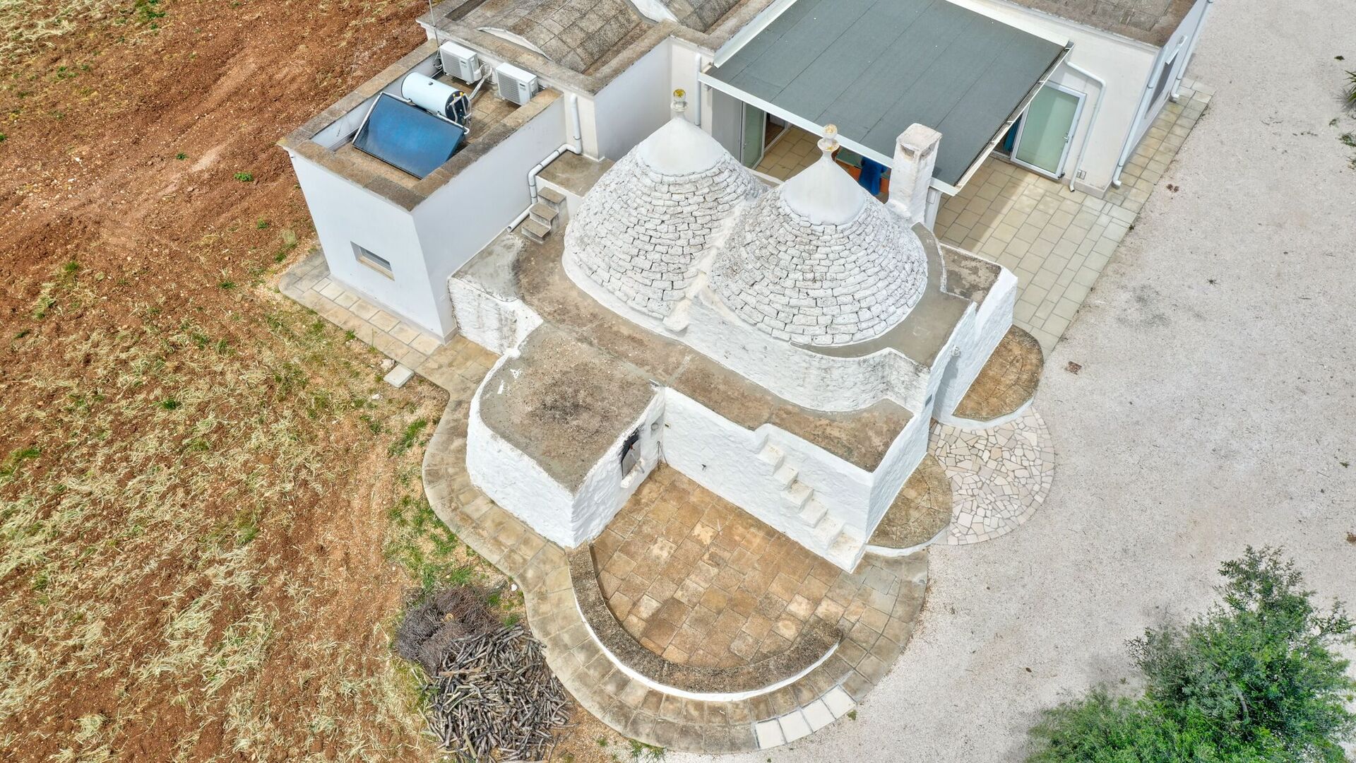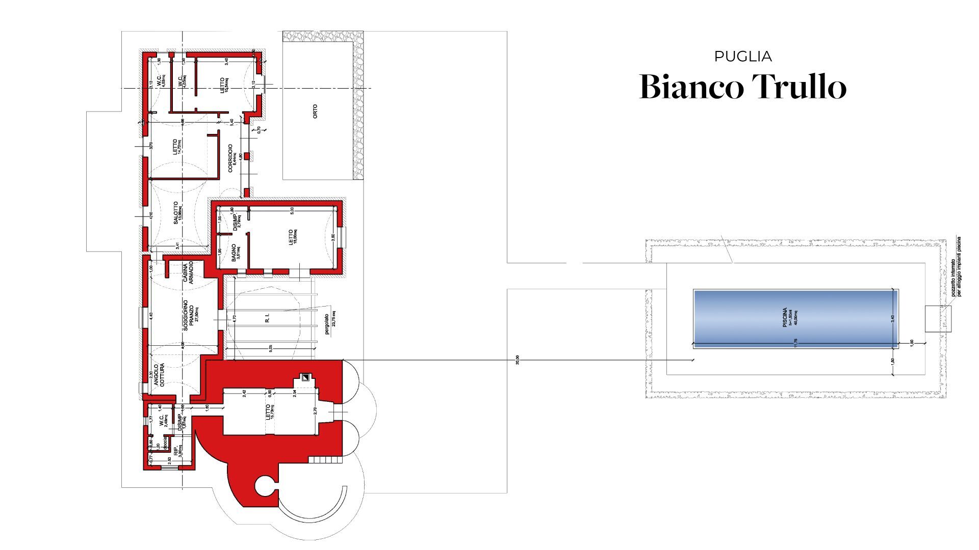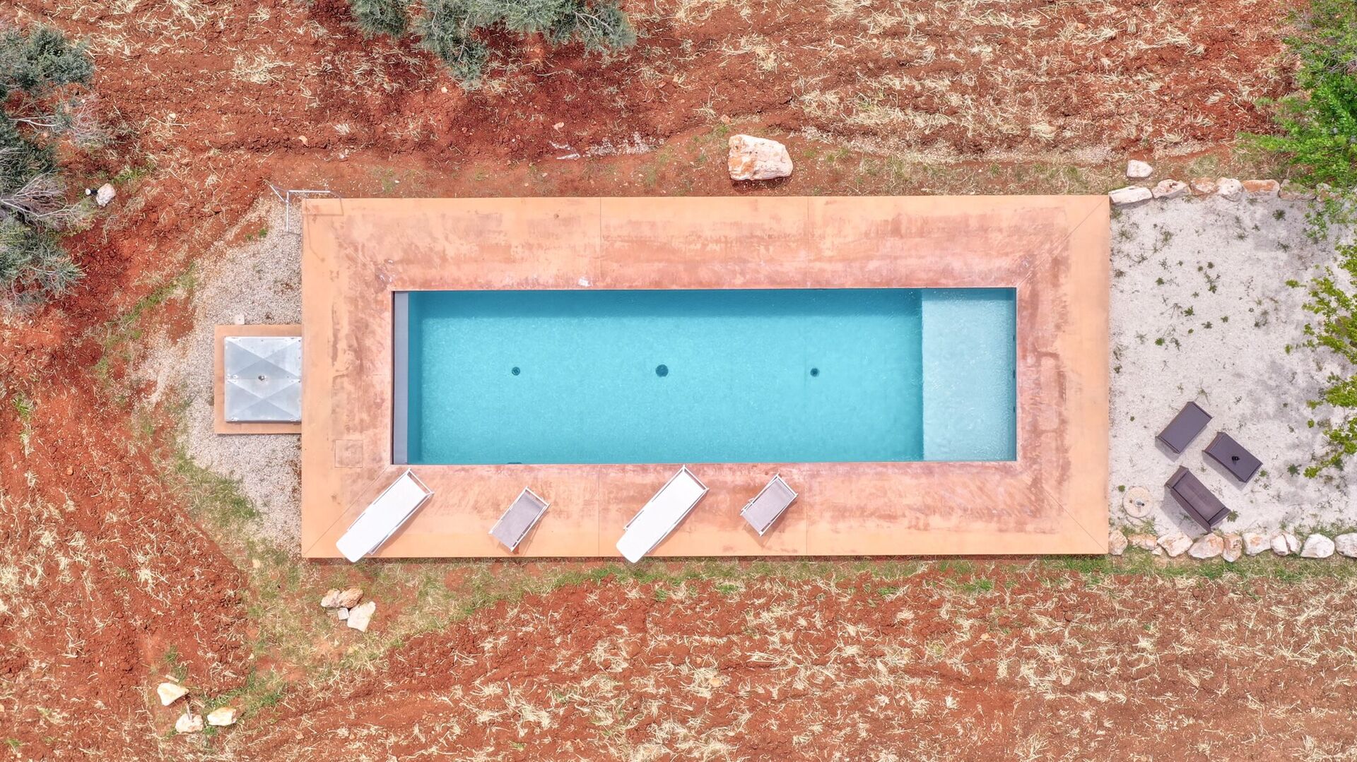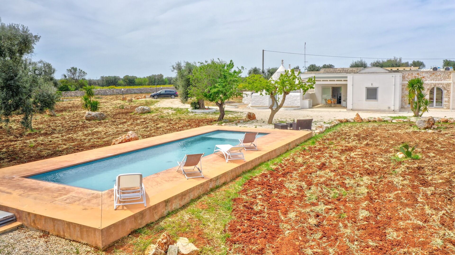 The outdoor spaces are characterized by a vast land full of fruit trees that frames the elegant swimming pool for the exclusive use of guests (14x4x1.5) with solarium and covered patio.