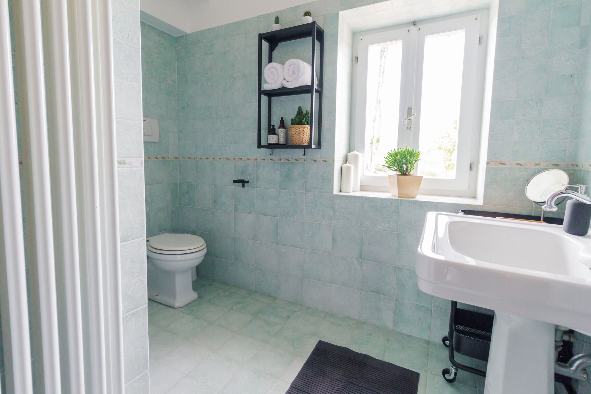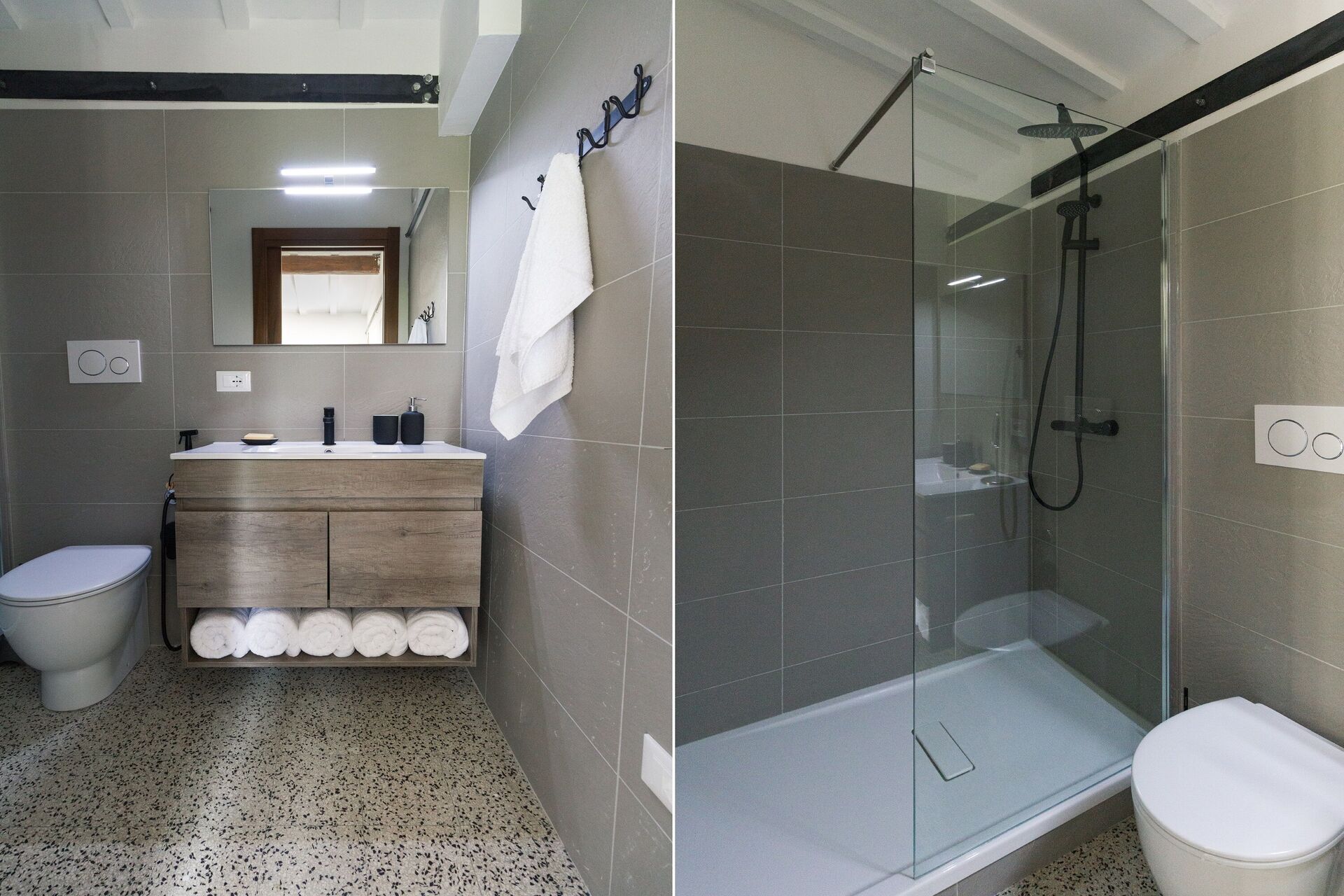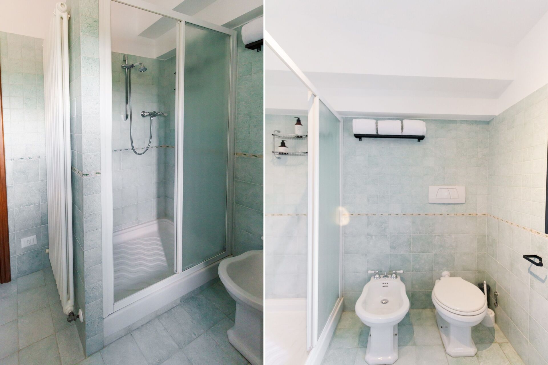 Badezimmer: Waschbecken, WC, Bidet, Dusche.