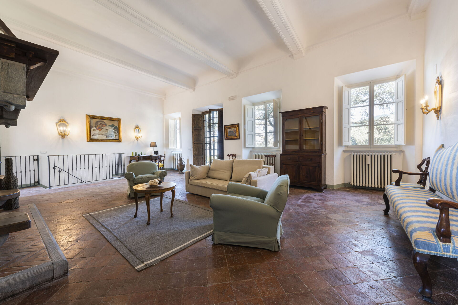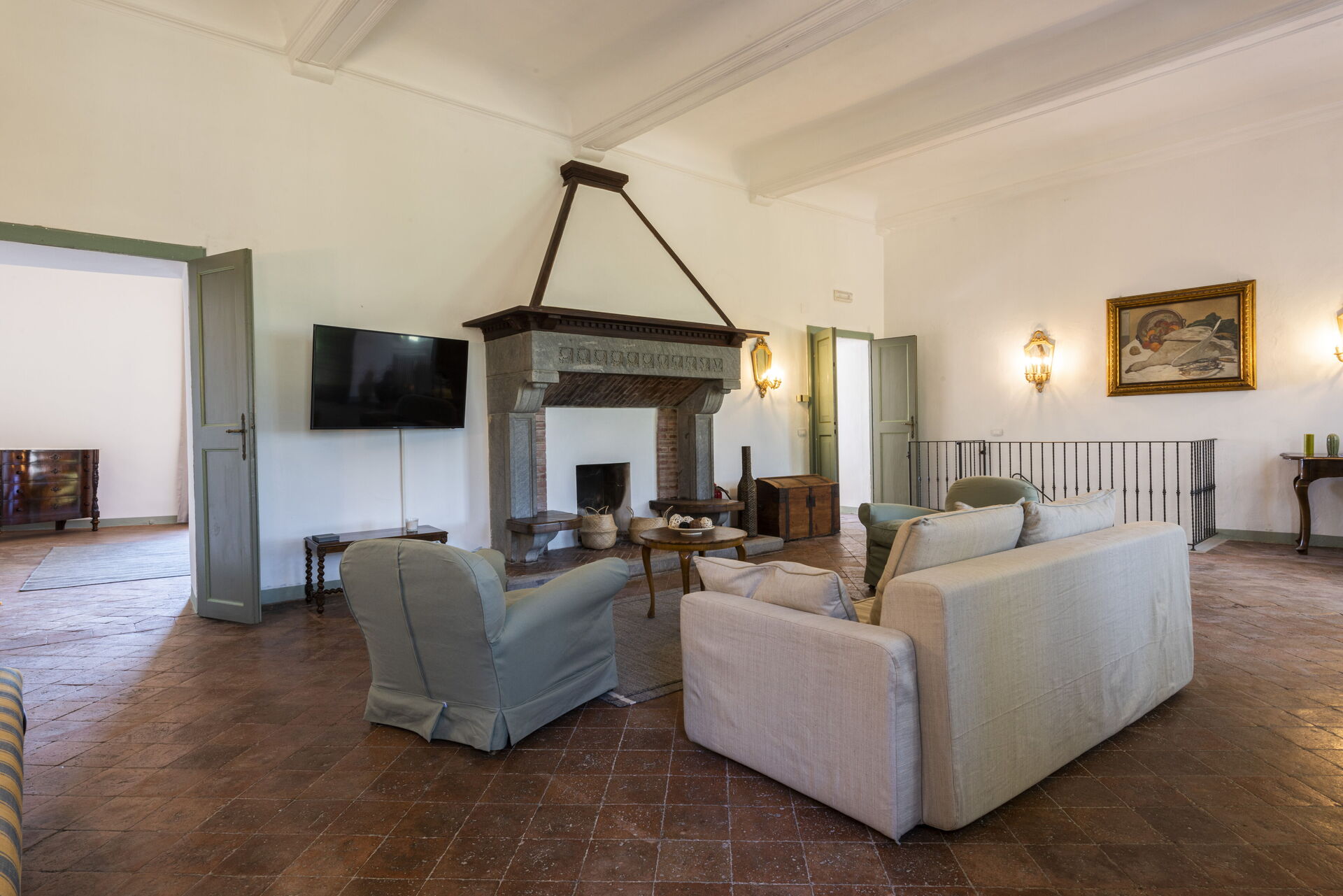 Wohnzimmer: zwei Sofas, zwei Sessel, Schreibtisch, Kamin, WiFi Internet, TV, Ausgang auf den Garten.