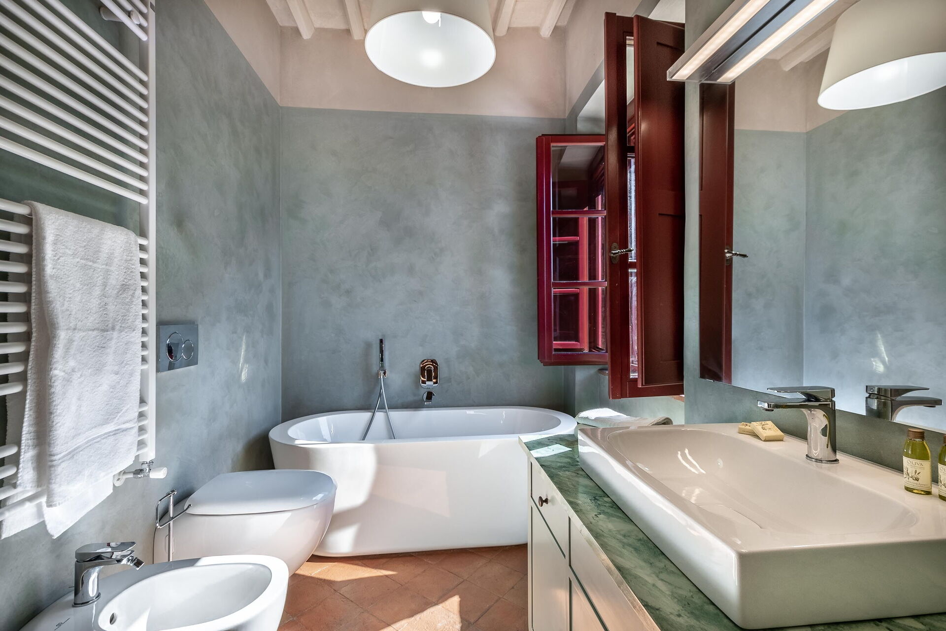 Schlafzimmer mit Bad: Doppelbett, WiFi Internet, Fliegengitter, Satelliten-TV, tragbarer Ventilator, Sofa, Sessel, Schreibtisch, Waschbecken, WC, Bidet, Dusche, Fön, Ausgang auf den Garten, Ausgang auf die Terrasse.