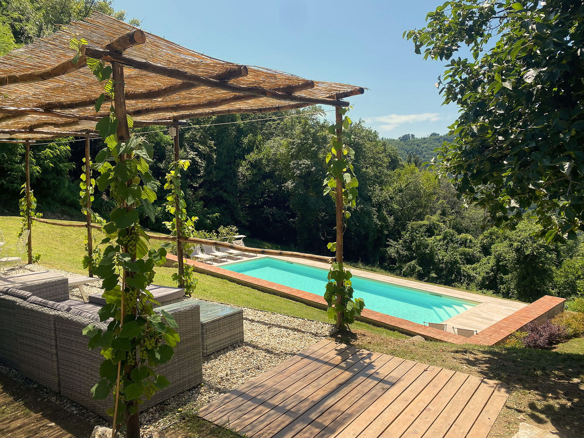 Garten: Schwimmbad (privat, Breite: 4m, Länge: 12m, Tiefe: 150m, Außen), Außenbereich für das Essen im Freien, Esstisch (Personen: 12), Pavillon, Gartenmöbel, acht Sonnenliegen.