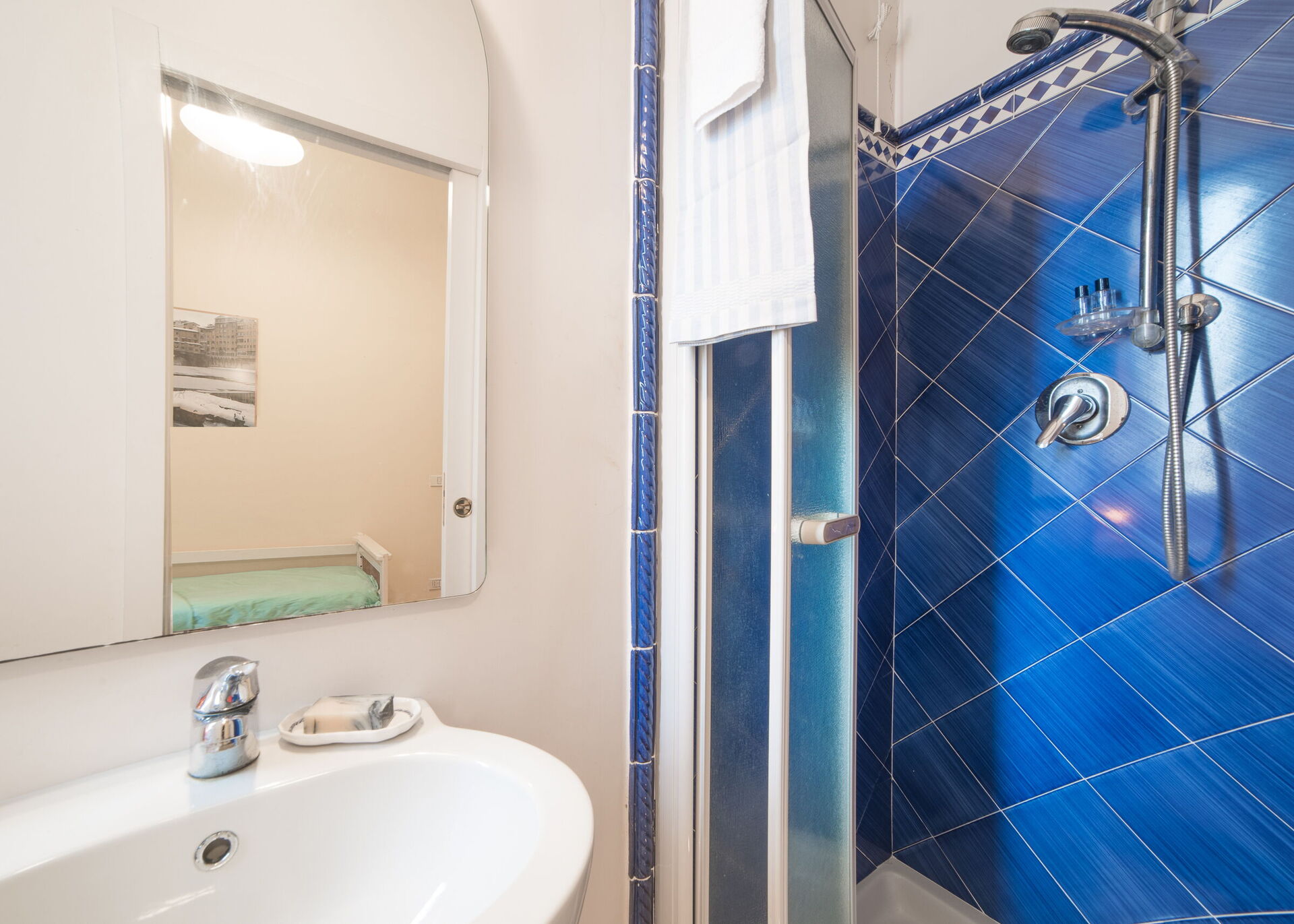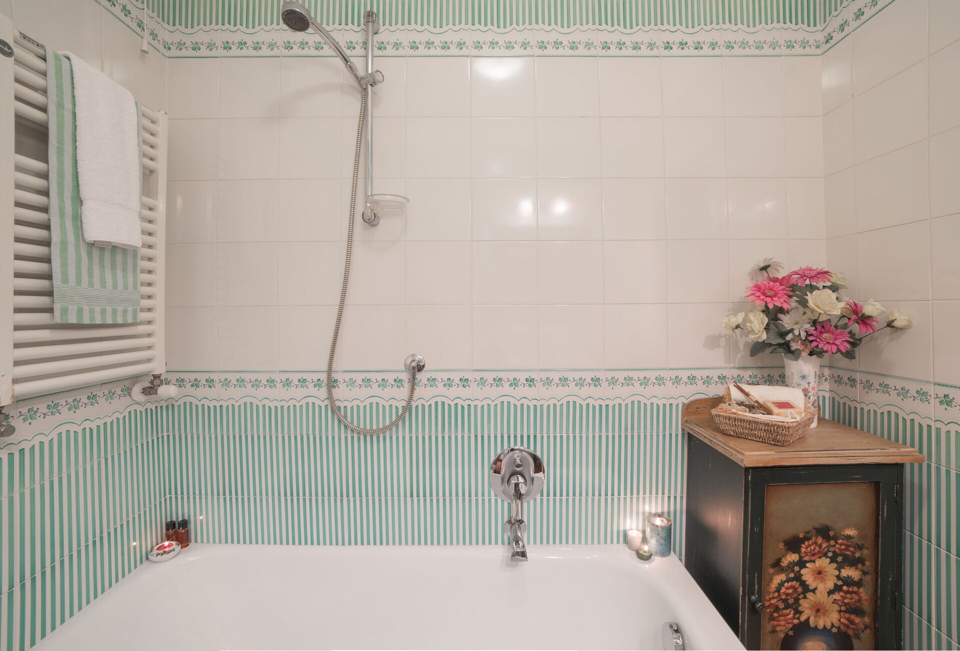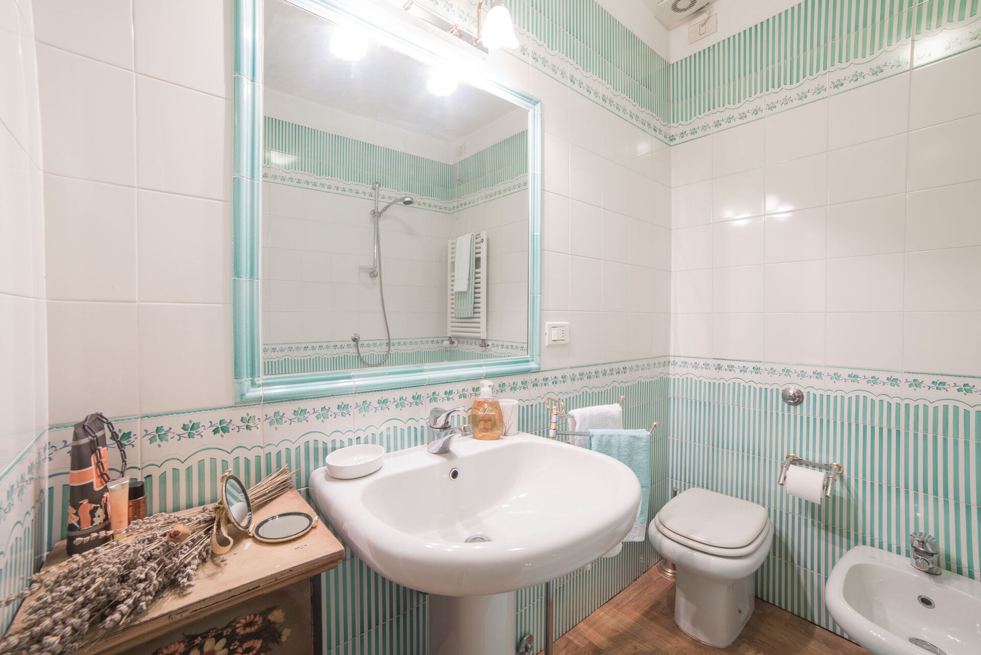 Badezimmer 2: Waschbecken, WC, Bidet, Dusche, Fön, Waschmaschine.
