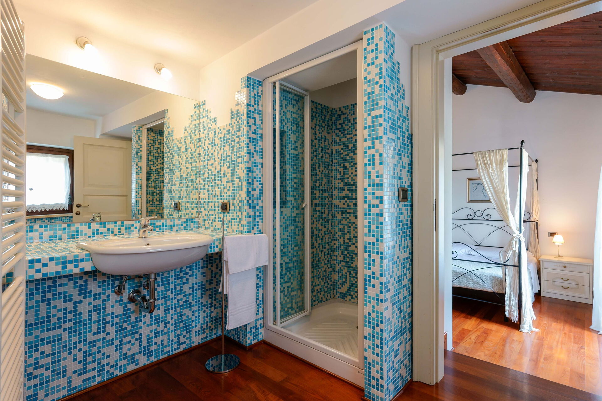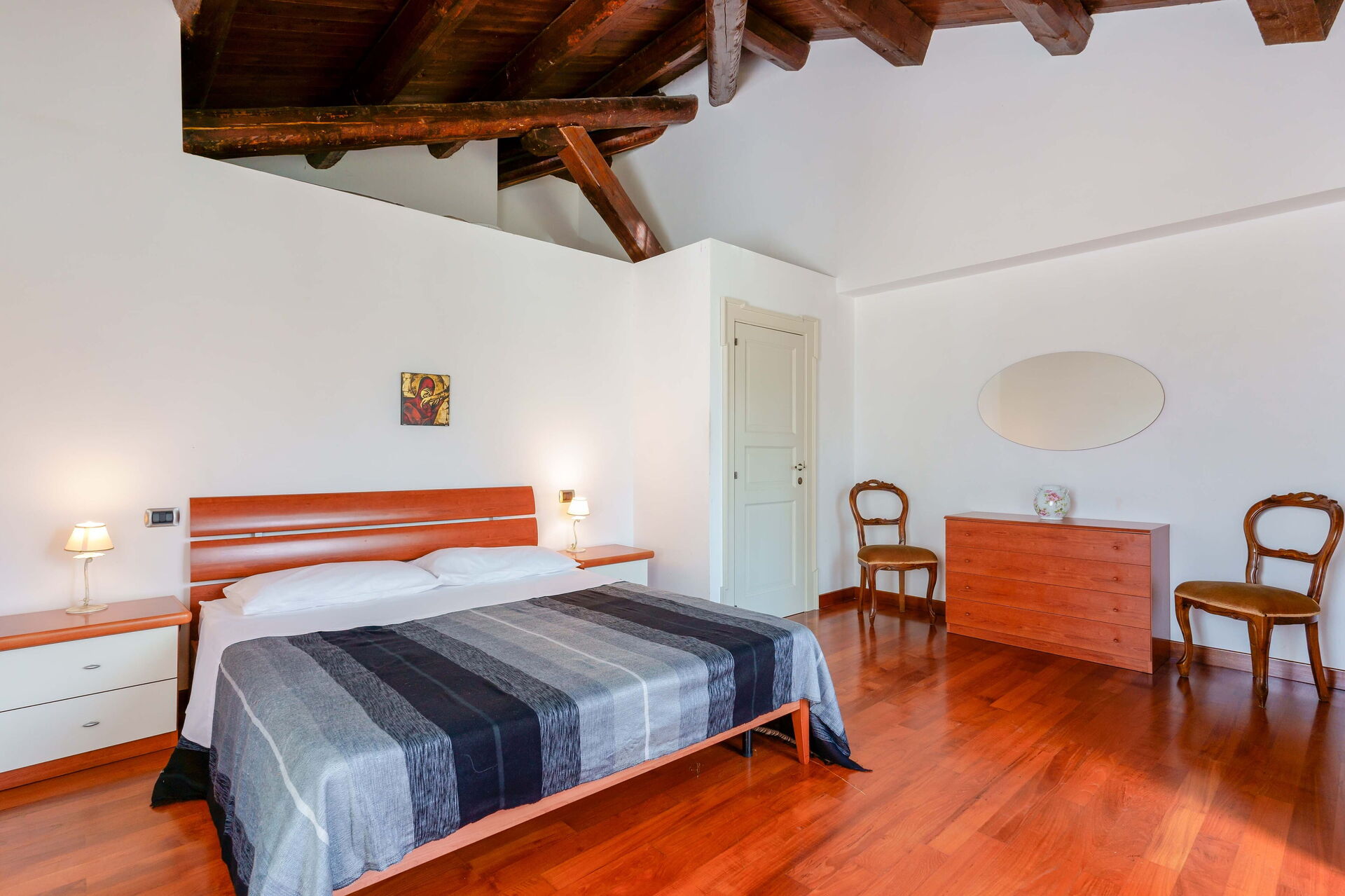 Schlafzimmer mit Bad (25 m2): Doppelbett (Breite: 160m, Länge: 200m), WiFi Internet, Fliegengitter, Kühlschrank, Waschbecken, WC, Bidet, Dusche, Fön, Badezimmer ohne Fenster, Ausgang auf den Balkon, Ausgang auf die Terrasse.
