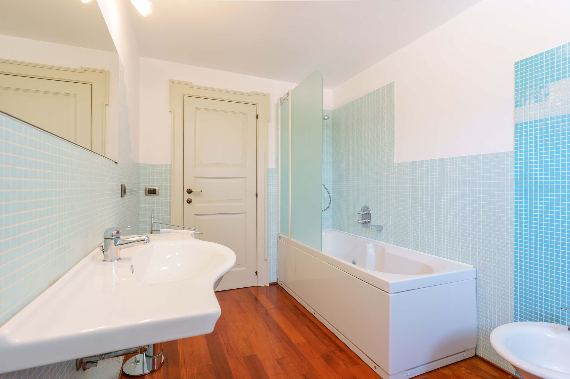 Badezimmer (8 m2): Whirlpool-Badewanne, Waschbecken, WC, Bidet, Fön.