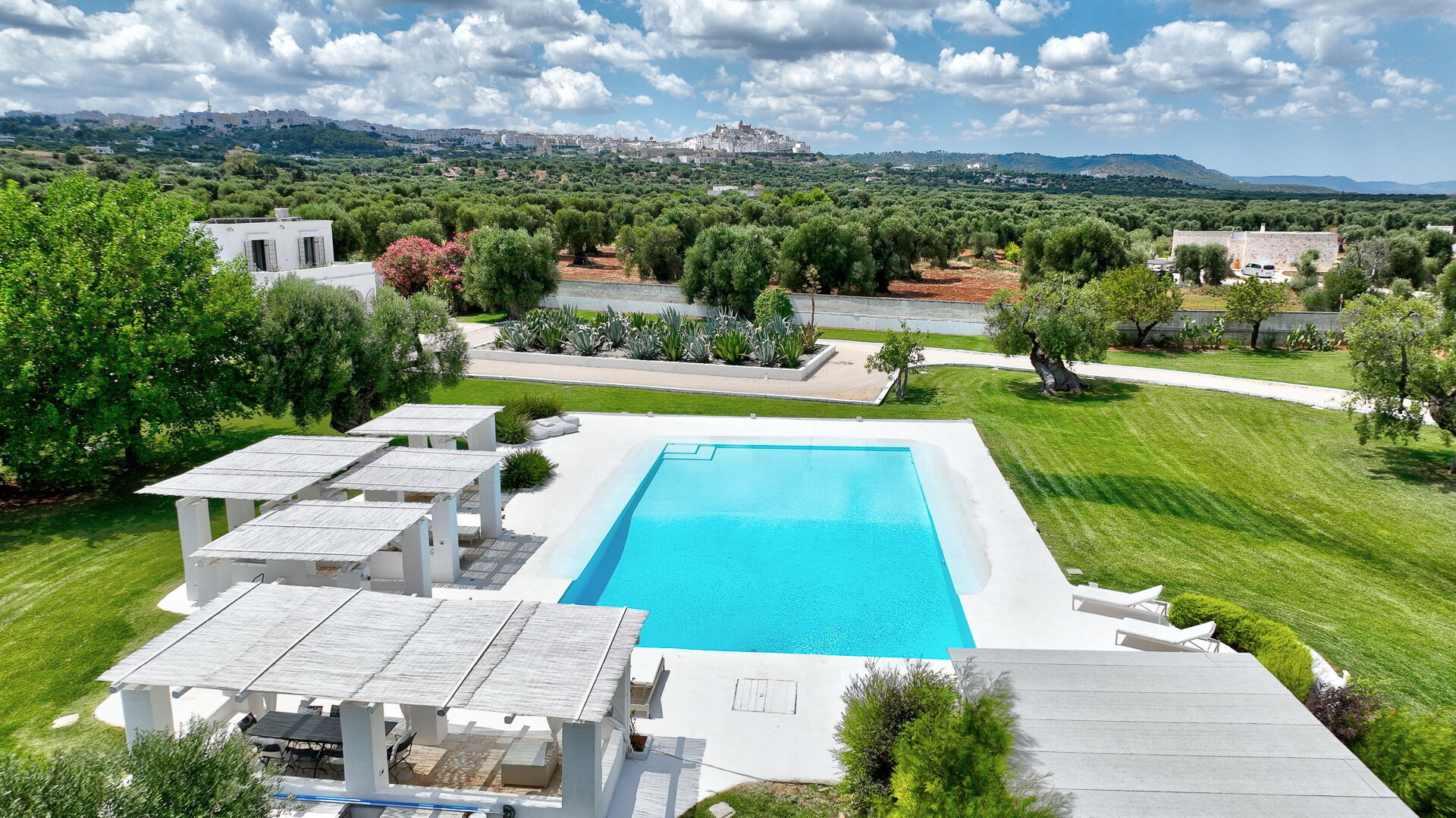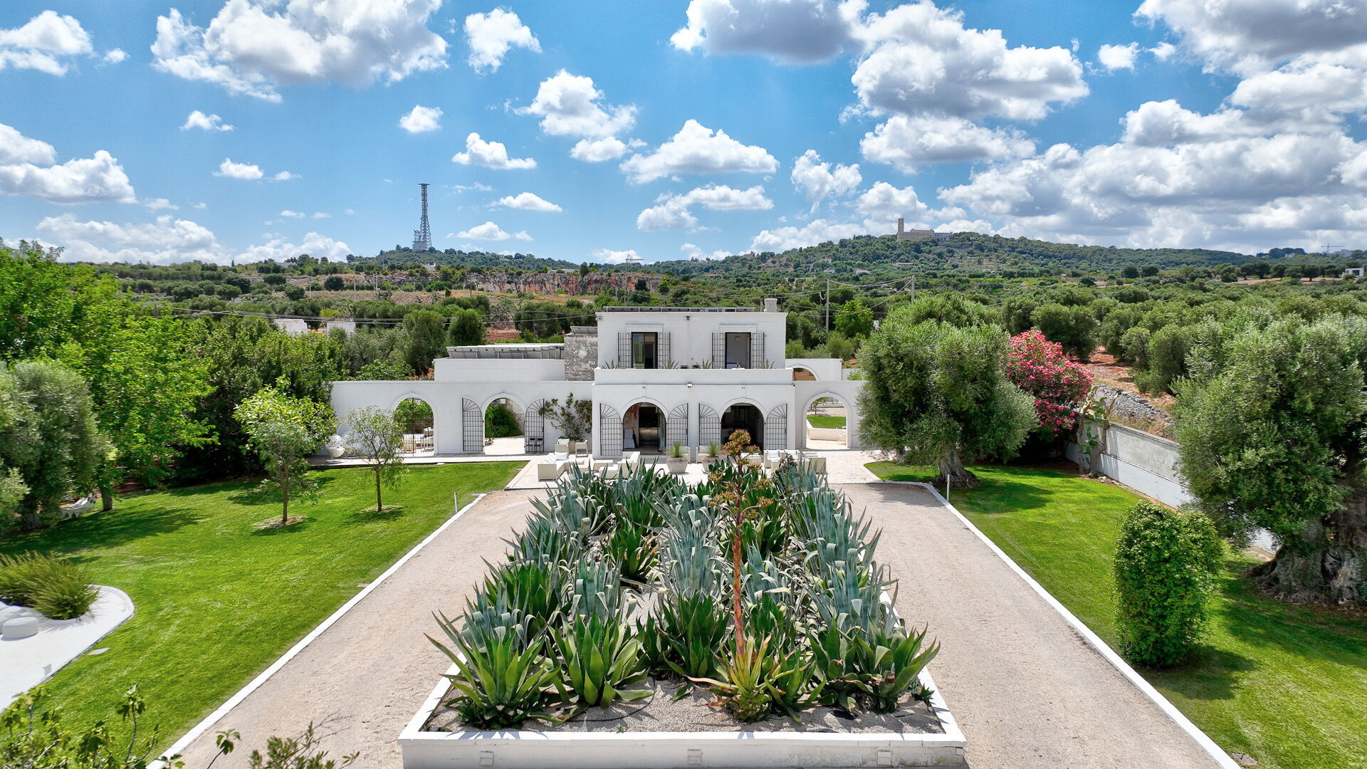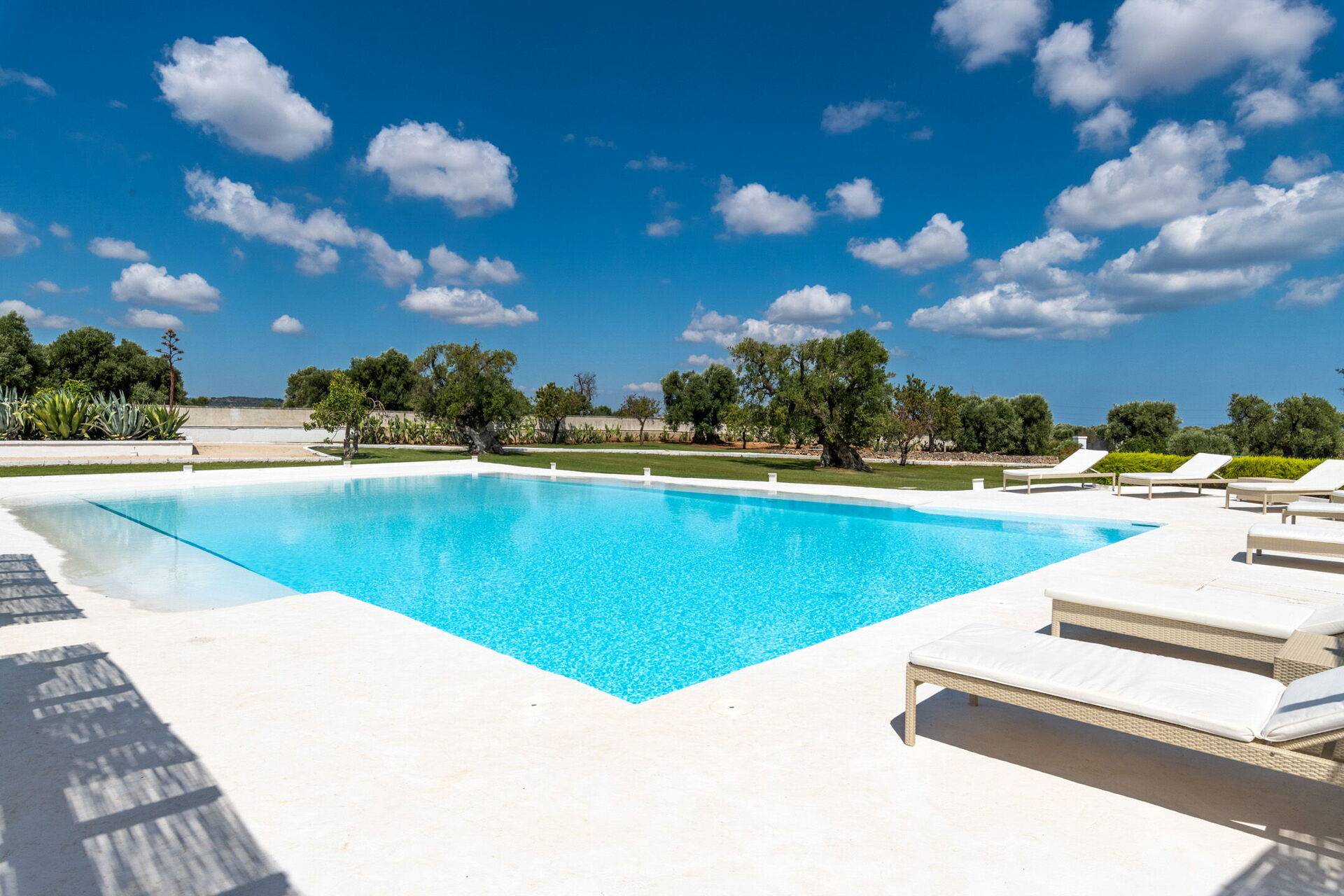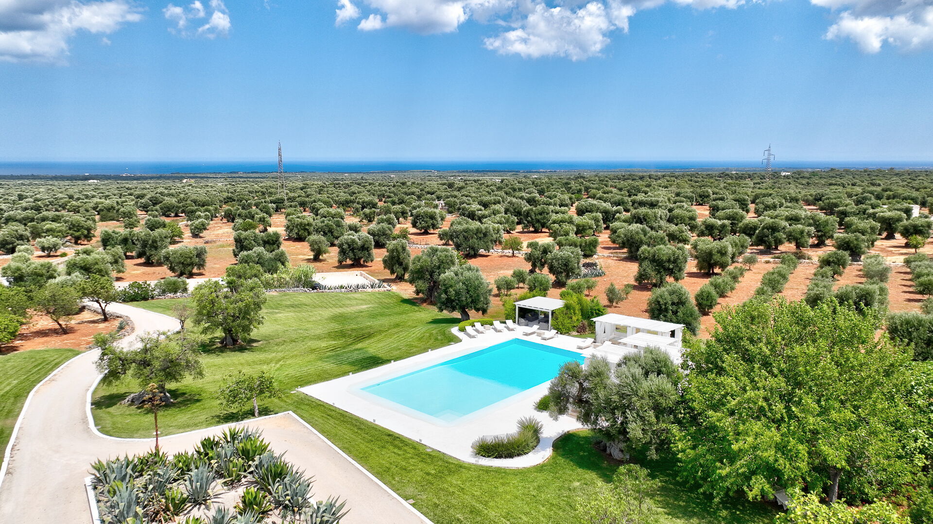 The Villa is located within the "Piana degli Ulivi Monumentali", an enormous flat expanse cultivated with olive trees with centuries-old and thousand-year-old trees, spread over two levels and is composed of a large living area, an island kitchen and nine bedrooms. double rooms with en-suite bathroom as well as a garden with a large swimming pool.